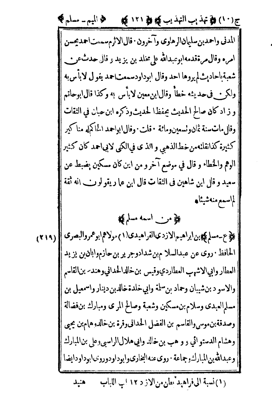 219- "ع – مسلم" بن إبراهيم الأزدي الفراهيدي1 مولاهم أبو عمرو البصري الحافظ روى عن عبد السلام بن شداد وجرير بن حازم وأبان بن يزيد العطار وأبي الأشهب العطاردي وقيس بن خالد الحداني وهند بن القاسم والأسود بن شيبان وحماد بن سلمة وأبي خلدة بن دينار وإسماعيل بن مسلم العبدي وسلام بن مسكين وشعبة وصالح المري ومبارك بن فضالة وصدقة بن موسى والقاسم بن الفضل الحداني وقرة بن خالد وهمام بن يحيى وهشام الدستوائي ووهب بن خالد وأبي هلال الراسبي وعلي بن المبارك وعبد الله بن المبارك وجماعة روى عنه البخاري وأبو داود وروى أبو داود أيضا