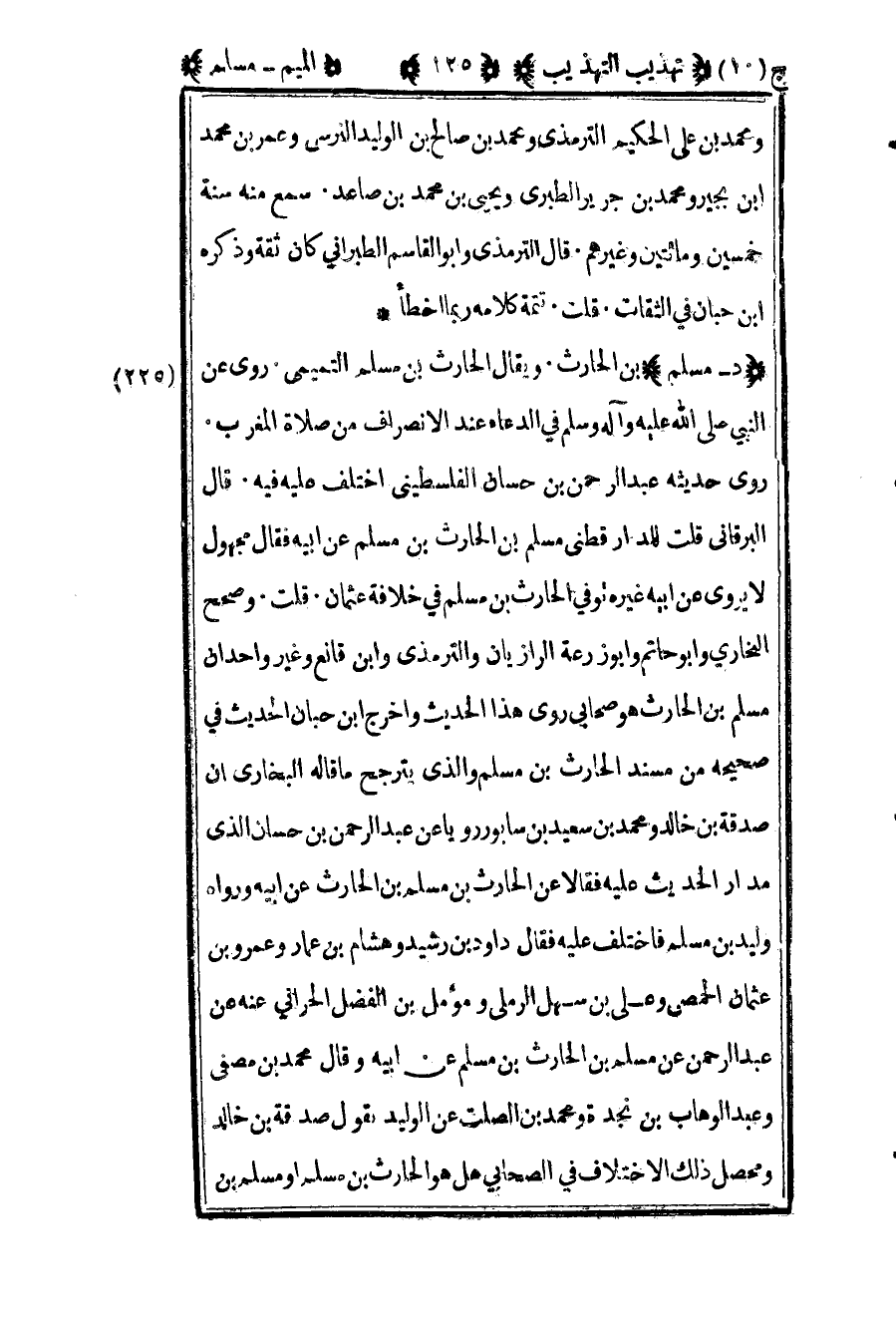 225 – "د – مسلم" بن الحارث ويقال الحارث بن مسلم التميمي روى عن النبي صلى الله عليه وسلم في الدعاء عند الانصراف من صلاة المغرب روى حديثه عبد الرحمن بن حسان الفلسطيني اختلف عليه فيه قال البرقاني قلت للدار قطني مسلم بن الحارث بن مسلم عن أبيه فقال مجهول لا يروي عن أبيه غيره توفي الحارث بن مسلم في خلافة عثمان قلت وصحح البخاري وأبو حاتم وأبو زرعة الرازيان والترمذي وابن قانع وغير واحد أن مسلم بن الحارث هو صحابي روى هذا الحديث وأخرج بن حبان الحديث في صحيحه من مسند الحارث بن مسلم والذي يترجح ما قاله البخاري أن صدقة بن خالد ومحمد بن سعيد بن سابور رويا عن عبد الرحمن بن حسان الذي مدار الحديث عليه فقالا عن الحارث بن مسلم بن الحارث عن أبيه ورواه وليد بن مسلم فاختلف عليه فقال داود بن رشيد وهشام بن عمار وعمرو بن عثمان الحمصي وعلي بن سهل الرملي ومؤمل بن الفضل الحراني عنه عن عبد الرحمن عن مسلم بن الحارث بن مسلم عن أبيه وقال محمد بن مصفى وعبد الوهاب بن نجدة ومحمد بن الصلت عن الوليد يقول صدقة بن خالد ومحصل ذلك الاختلاف في الصحابي هل هو الحارث بن مسلم أو مسلم بن