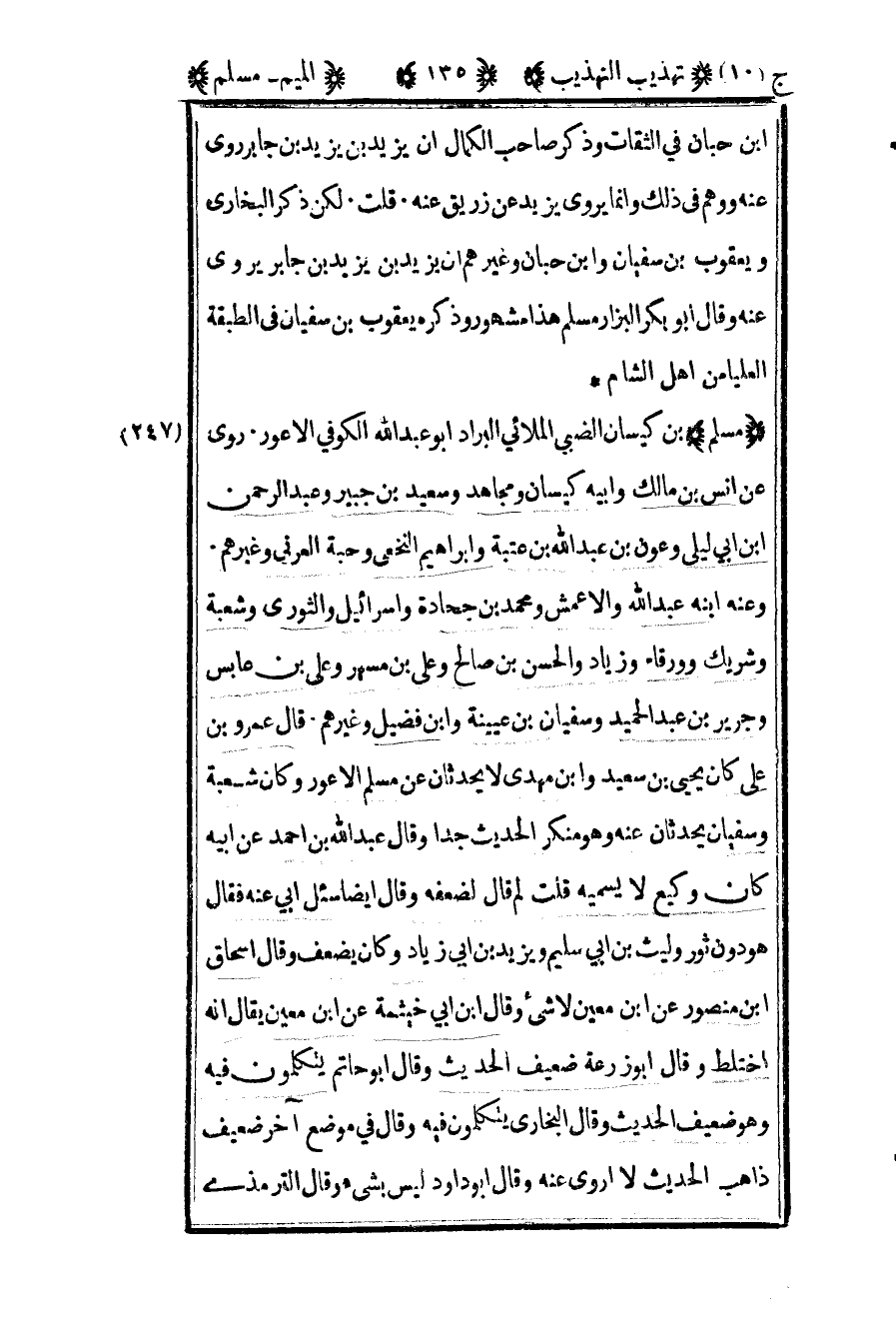 247- "مسلم" بن كيسان الضبي الملائي البراد أبو عبد الله الكوفي الأعور روى عن أنس بن مالك وأبيه كيسان ومجاهد وسعيد بن جبير وعبد الرحمن بن أبي ليلى وعون بن عبد الله عتبة وإبراهيم النخعي وحبة العرني وغيرهم وعنه بن عبد الله والأعمش ومحمد بن جحادة وإسرائيل والثوري وشعبة وشريك وورقاء وزياد والحسن بن صالح وعلى بن مسهر وعلي بن عابس وجرير بن عبد الحميد وسفيان بن عيينة وابن فضيل وغيرهم قال عمرو بن علي كان يحيى بن سعيد وابن مهدي لا يحدثان عن مسلم الأعور وكان شعبة وسفيان يحدثان عنه وهو منكر الحديث جدا وقال عبد الله بن احمد عن أبيه كان وكيع لا يسميه قلت لم قال لضعفه وقال أيضا سئل أبي عنه فقال هو دون ثور وليث بن أبي سليم ويزيد بن أبي زياد وكان يضعف وقال إسحاق بن منصور عن بن معين لا شيء وقال بن أبي خيثمة عن أبن معين يقال أنه اختلط وقال أبو زرعة ضعيف الحديث وقال أبو حاتم يتكلمون فيه وهو ضعيف الحديث وقال البخاري يتكلمون فيه وقال في موضع آخر ضعيف ذاهب الحديث لا أروى عنه وقال أبو داود ليس بشيء وقال الترمذي