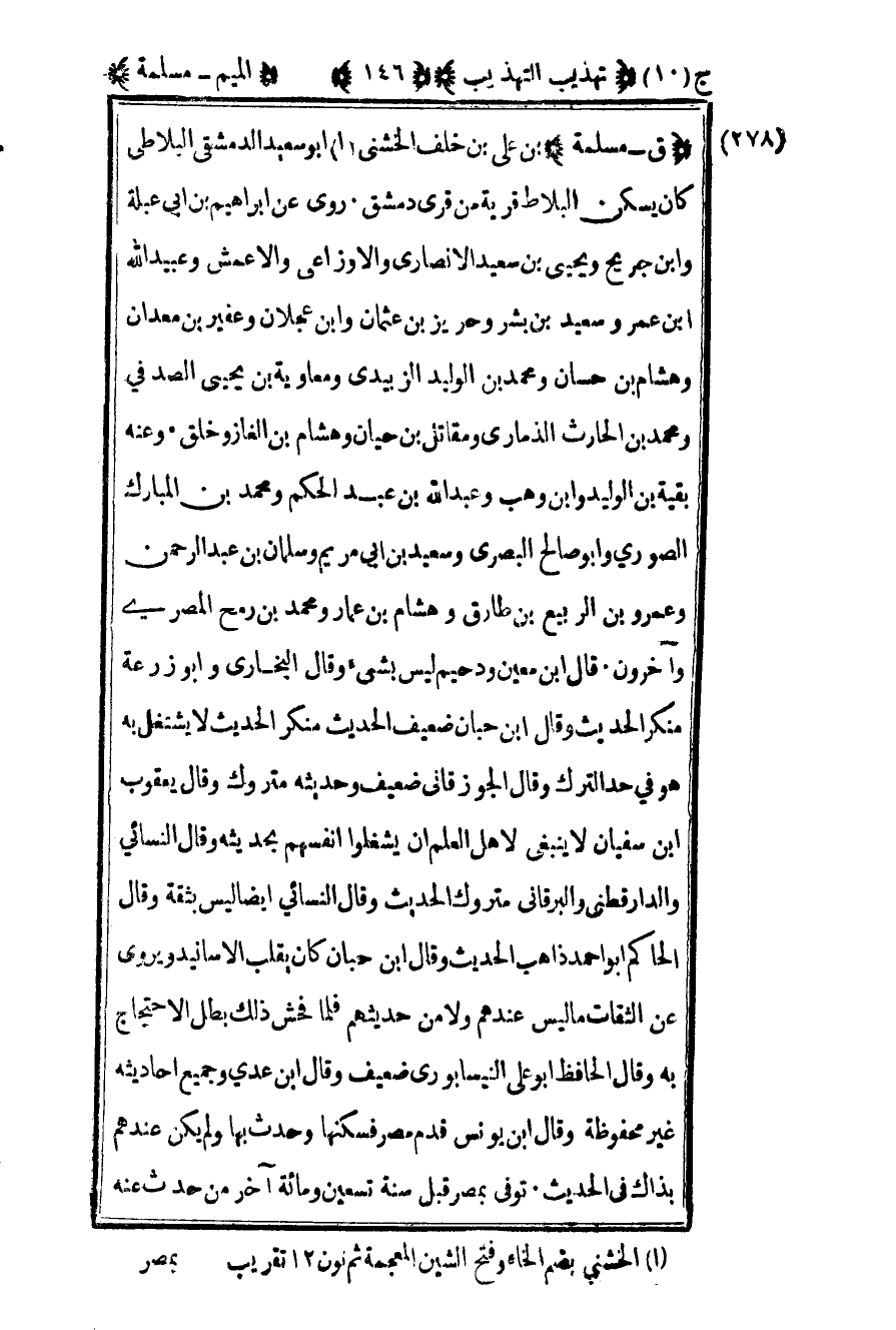 278- "ق – مسلمة" بن علي بن خلف الخشني1 أبو سعيد الدمشقي البلاطي كان يسكن البلاط قرية من قرى دمشق روى عن إبراهيم بن أبي عبلة وابن جريج ويحيى بن سعيد الأنصاري والأوزاعي والأعمش وعبد الله بن عمر وسعيد بن بشر وحريز بن عثمان وابن عجلان وعفير بن معدان وهشام بن حسان ومحمد بن الوليد الزبيدي ومعاوية بن يحيى الصدفي ومحمد بن الحارث الذماري ومقاتل بن حيان وهشام بن الغاز وخلق وعنه بقية بن الوليد وابن وهب وعبد الله بن عبد الحكم ومحمد بن المبارك الصوري وأبو صالح البصري وسعيد بن أبي مريم وسلمان بن عبد الرحمن وعمرو بن الربيع بن طارق وهشام بن عمار ومحمد بن رمح المصري وآخرون قال ابن معين ودحيم ليس بشيء وقال البخاري وأبو زرعة منكر الحديث وقال ابن حبان ضعيف الحديث منكر الحديث لا يشتغل به هو في حد الترك وقال الجوزقاني ضعيف وحديثه متروك وقال يعقوب بن سفيان لا ينبغي لأهل العلم أن يشغلوا أنفسهم بحديثه وقال النسائي والدارقطني والبرقاني متروك الحديث وقال النسائي أيضا ليس بثقة وقال الحاكم أبو أحمد ذاهب الحديث وقال ابن حبان كان يقلب الأسانيد ويروي عن الثقات ما ليس عندهم ولا من حديثهم فلما فحش ذلك بطل الاحتجاج به وقال الحافظ أبو على النيسابوري ضعيف وقال بن عدي وجميع أحاديثه غير محفوظة وقال بن يونس قدم مصر فسكنها وحدث بها ولم يكن عندهم بذاك في الحديث توفي بمصر قبل سنة تسعين ومائة آخر من حدث عنه