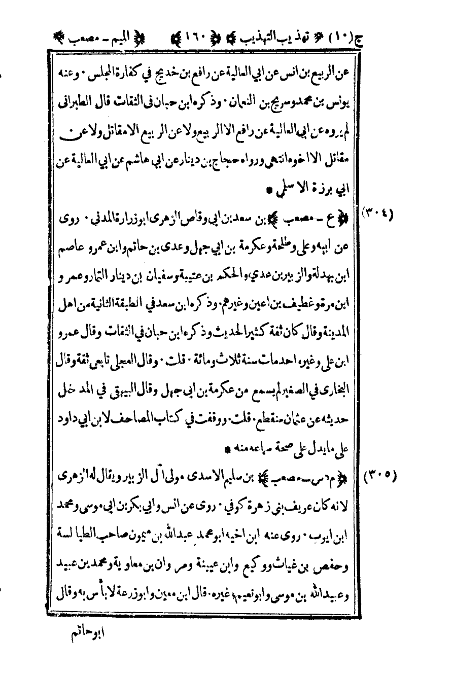 304- "ع – مصعب" بن سعد بن أبي وقاص الزهري أبو زرارة المدني روى عن أبيه وعلي وطلحة وعكرمة بن أبي جهل وعدي بن حاتم وابن عمر وعاصم بن بهدلة والزبير بن عدي والحكم بن عتيبة وسفيان بن دينار التمار وعمرو بن مرة وغطيف بن أعين وغيرهم وذكره بن سعد في الطبقة الثانية من أهل المدينة وقال كان ثقة كثير الحديث وذكره ابن حبان في الثقات وقال عمرو بن علي وغيره أحد مات سنة ثلاث ومائة قلت وقال العجلي تابعي ثقة وقال البخاري في الصغير لم يسمع من عكرمة بن أبي جهل وقال البيهقي في المدخل حديثه عن عثمان منقطع قلت ووقفت في كتاب المصاحف لابن أبي داود على ما يدل على صحة سماعه منه.