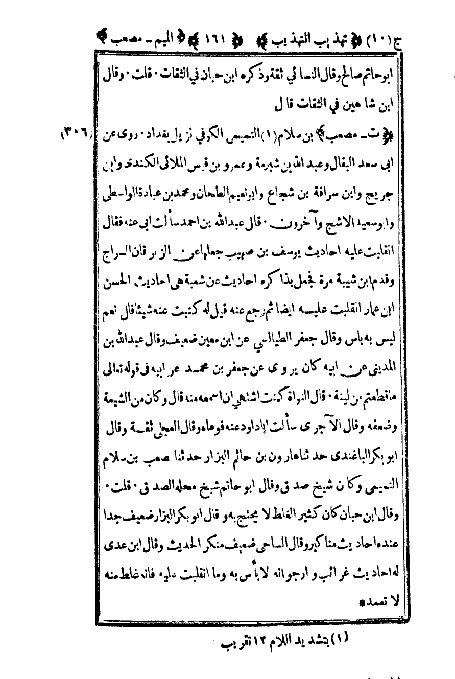 306- "ت – مصعب" بن سلام1 التميمي الكوفي نزيل بغداد روى عن أبي سعد البقال وعبد الله شبرمة وعمرو بن قيس الملائي الكندي وابن جريج وابن سراقة بن شجاع وأبو نعيم الطحان ومحمد بن عبادة الواسطي وأبو سعيد الأشج وآخرون قال عبد الله بن أحمد سألت أبي عنه فقال انقلبت عليه أحاديث يوسف بن صهيب جعلها عن الزبرقان السراج وقدم ابن شيبة مرة فجعل يذاكره أحاديث عن شعبة هي أحاديث الحسن بن عمار انقلبت عليه أيضا ثم رجع عنه قيل له كتبت عنه شيئا قال نعم ليس به بأس وقال جعفر الطيالسي عن ابن معين ضعيف وقال عبد الله بن المديني عن أبيه كان يروي عن جعفر بن محمد عن أبيه في قوله تعالى: {مَا قَطَعْتُمْ مِنْ لِينَةٍ} قال النواة كنت أشتهي أن أسمعه منه قال وكان من الشيعة وضعفه وقال الآجري سألت أبا داود عنه فوهاه وقال العجلي ثقة وقال أبو بكر الباغندي حدثنا هارون بن حاتم البزار حدثنا مصعب بن سلام التميمي وكان شيخ صدق وقال أبو حاتم شيخ محله الصدق قلت وقال بن حبان كان كثير الغلط لا يحتج به وقال أبو بكر البزار ضعيف جدا عنده أحاديث مناكير وقال الساجي ضعيف منكر الحديث وقال بن عدي له أحاديث غرائب وأرجو أنه لا بأس به وما انقلبت عليه فإنه غلط منه لا تعمد.