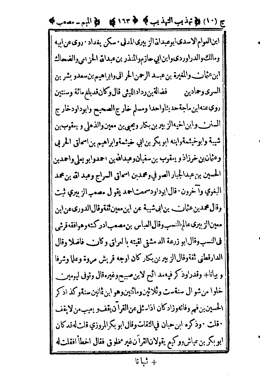 ابن العوام الأسدي أبو عبد الله الزبيري المدني سكن بغداد روى عن أبيه ومالك والداروردي وابن أبي حازم والمنذر بن عبد الله الحزامي والضحاك بن عثمان والمغيرة بن عبد الرحمن الحراني وإبراهيم بن سعد وبشر بن السري وحماد بن فضالة بن رداد الليثي قال وكان قد بلغ مائة وسنتين روى عنه بن ماجة حديثا واحدا ومسلم خارج الصحيح وأبو داود خارج السنن وابن أخيه الزبير بن بكار ويحيى بن معين الذهلي ويعقوب بن شيبة وأبو خيثمة وابنه أبو بكر بن أبي خيثمة وإبراهيم بن إسحاق الحربي وعثمان بن خرزاذ ويعقوب بن سفيان وعبد الله بن أحمد وأبو يعلى وأحمد بن الحسين بن عبد الجبار الصوفي ومحمد بن إسحاق السراج وعبد الله بن محمد البغوي وآخرون قال أبو داود سمعت أحمد يقول مصعب الزبيري ثبت وقال محمد بن عثمان بن أبي شيبة عن ابن معين وقال الدوري عن أبن معين الزبيري عالم بالنسب وقال العباس بن مصعب أدركته وهو أفقه قرشي في النسب وقال أبو زرعة الدمشقي لقيته بالعراق وكان فاضلا وقال الدارقطني ثقة وقال الزبير بن بكار كان أوجه قريش مروة وعلما وشرفا وبيانا وقدرا وذكر فيه مدائح لابن صبيح وغيره قال وتوفي ليومين خلوا من شوال سنة ست وثلاثين ومائتين وهو بن ثمانين سنة وكذا ذكر الحسين بن فهم وفاته وزاد كان إذا سئل عن القرآن يقف ويعيب من لا يقف قلت وذكره ابن حبان في الثقات وقال أبو بكر المروزي قلت له قد كان أبو بكر بن عياش ووكيع يقولان القرآن غير مخلوق فقال أخطأ فقلت له