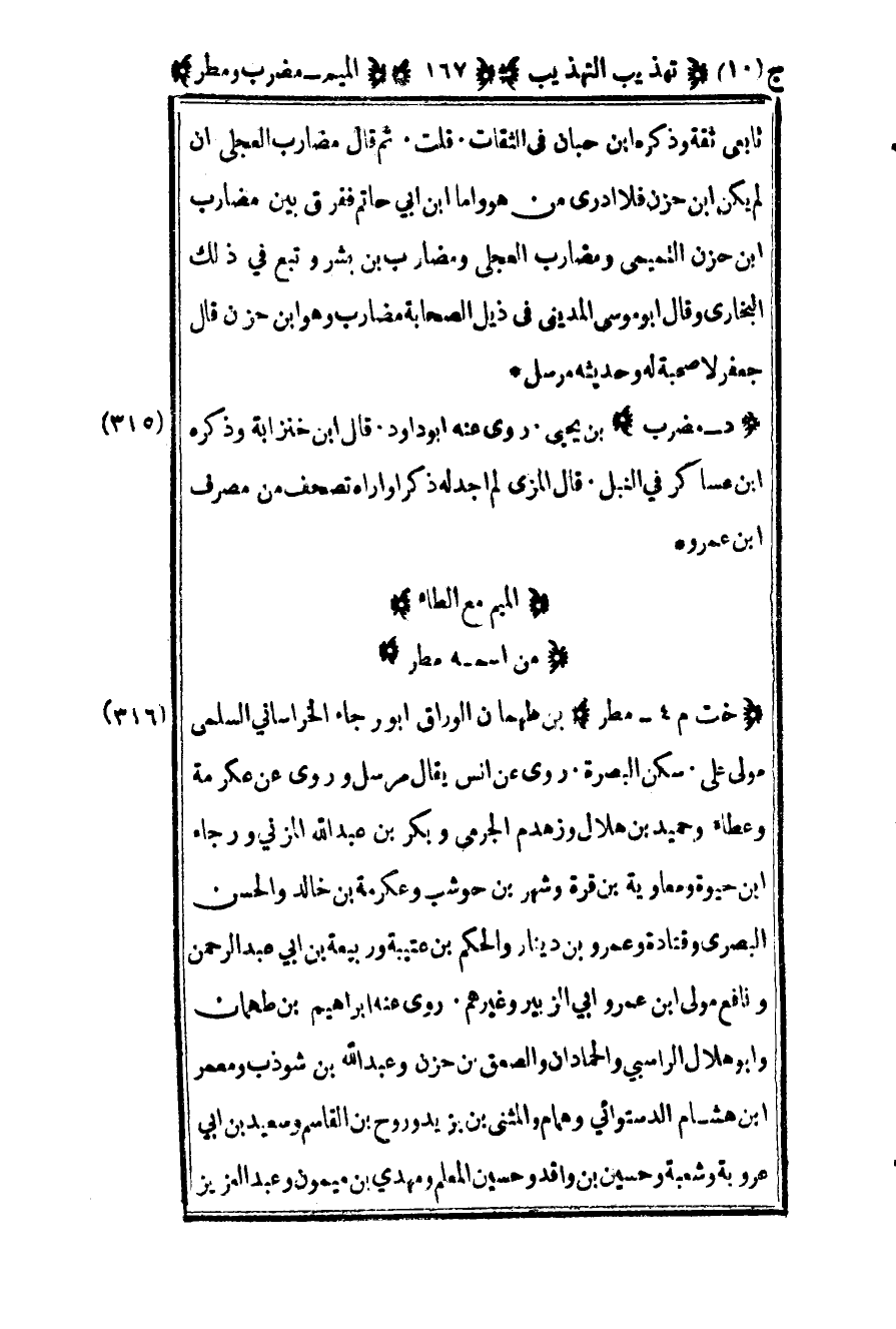 316- "خت م 4 – مطر" بن طهمان الوراق أبو رجاء الخراساني السلمي مولى علي سكن البصرة روى عن أنس يقال مرسل وروى عن عكرمة وعطاء وحميد بن هلال وزهدم الجرمي وبكر بن عبد الله المزني ورجاء بن حيوة ومعاوية بن قرة وشهر بن حوشب وعكرمة بن خالد والحسن البصري وقتادة وعمرو بن دينار والحكم بن عتيبة وربيعة بن أبي عبد الرحمن ونافع مولى بن عمر وأبي الزبير وغيرهم روى عنه إبراهيم بن طهمان وأبو هلال الراسبي والحمادان والصعق بن حزن وعبد الله بن شوذب ومعمر بن هشام الدستوائي وهمام والمثني بن يزيد وروح بن القاسم وسعيد بن أبي عروبة وشعبة وحسين بن واقد وحسين المعلم ومهدي بن ميمون وعبد العزيز