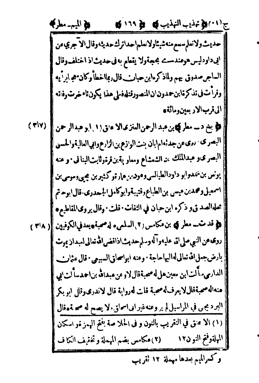 318- "قد ت – مطر" بن عكامس2 السلمي له صحبة يعد في الكوفيين روى عن النبي صلى الله عليه وسلم حديث إذا قضى الله تعالى لعبد أن يموت بأرض جعل الله تعالى له إليها حاجة وعنه أبو إسحاق السبيعي قال عثمان الدارمي سألت بن معين هل له صحبة قال لا وعن عبد الله بن أحمد سألت أبي عنه أله صحبة قال لا يعرف له صحبة قلت له رواية قال لا ندري وقال أبو بكر البرديجي في المراسيل لم يرو عنه غير أبي إسحاق لا يصح له صحبة قال