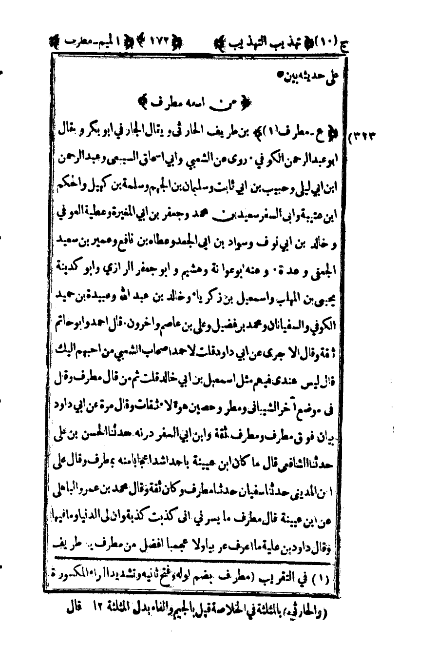 1 في التقريب "مطرف بضم أوله وفتح ثانيه وتشديد الراء المكسورة "والحارثي" بالمثلثة في الخلاصة قبل بالجيم والفاء بدل المثلثة 12.