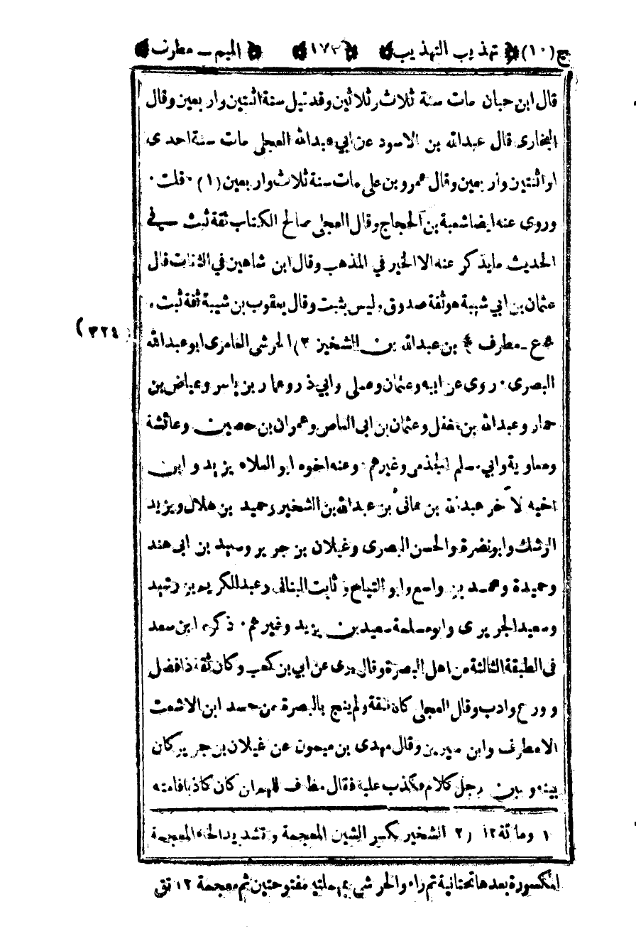324- "ع – مطرف" بن عبد الله بن الشخير2 الحرشي العامري أبو عبد الله البصري روى عن أبيه وعثمان وعلي وأبي ذر وعمار بن ياسر وعياض بن حمار وعبد الله بن مغفل وعثمان بن أبي العاص وعمران بن حصين وعائشة ومعاوية وأبي مسلم الجذمي وغيرهم وعنه أخوه أبو العلاء يزيد وابن أخيه الآخر عبد الله بن هانئ بن عبد الله بن الشخير وحميد بن هلال ويزيد الرشك وأبو نضرة والحسن البصري وغيلان بن جرير وسعيد بن أبي هند وحميدة ومحمد بن واسع وأبو التياح وثابت البناني وعبد الكريم بن رشيد وسعيد الجريري وأبو مسلمة سعيد بن يزيد وغيرهم ذكره بن سعد في الطبقة الثالثة من أهل البصرة وقال روى عن أبي بن كعب وكان ثقة ذا فضل وورع وأدب وقال العجلي كان ثقة ولم ينج بالبصرة من حسد بن الأشعث إلا مطرف وابن سيرين وقال مهدي بن ميمون عن غيلان بن جرير كان بينه وبين رجل كلام فكذب عليه فقال مطرف اللهم إن كان كاذبا فأمته