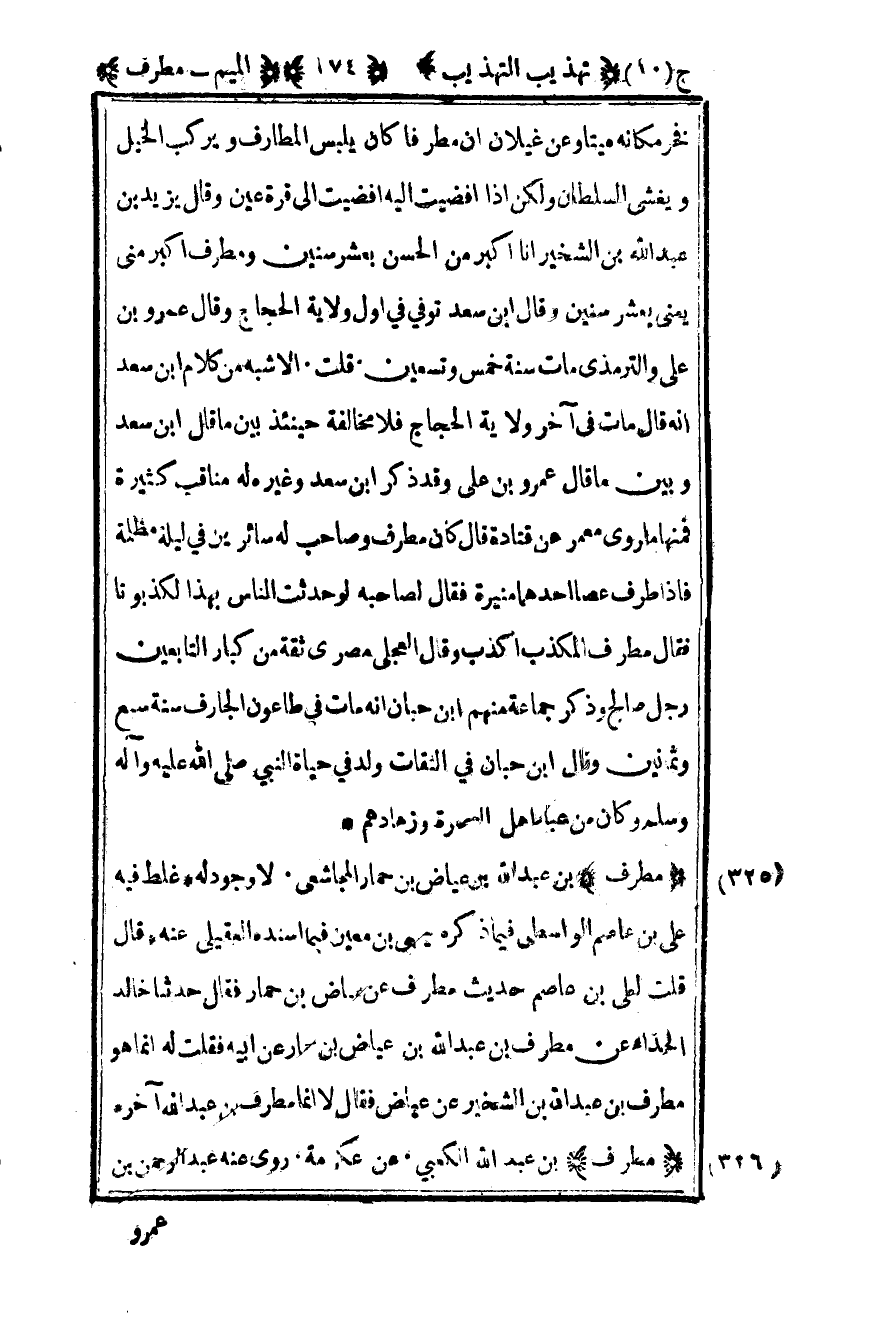 325- "مطرف" بن عبد الله بن عياض بن حمار المجاشعي لا وجود له غلط فيه علي بن عاصم الواسطي فيما ذكره يحيى بن معين فيما اسنده العقيلي عنه قال قلت لعلي بن عاصم حديث مطرف عن عياض بن حمار فقلت حدثنا خالد الحذاء عن مطرف بن عبد الله بن عياض بن حمار عن أبيه فقلت له إنما هو مطرف بن عبد الله بن الشخير عن عياض فقال لا إنما مطرف بن عبد الله آخره.