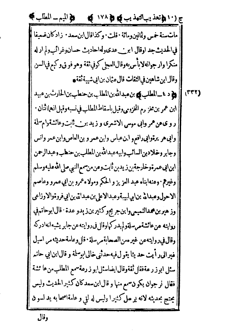 332 – "د 4 – المطلب" بن عبد الله بن المطلب بن حنطب بن الحارث بن عبيد بن عمر بن مخزوم المخزومي وقيل بإسقاط المطلب في نسبه وقيل إنهما اثنان روى عن عمر وأبي موسى الأشعري وزيد بن ثابت وعائشة وأم سلمة وأبي هريرة وأبي رافع وابن عباس وابن عمرو بن العاص وابن عمر وأنس وجابر وخلاد بن السائب وأبيه عبد الله بن المطلب بن حنطب وعبد الرحمن بن أبي عمرة وخارجة بن زيد بن ثابت وعن من سمع النبي صلى الله عليه وسلم وغيرهم وعنه أبناه عبد العزيز والحكم ومولاه عمرو بن أبي عمرو وعاصم الأحول وعبد الله بن أبي لبيبة وعبد الأعلى بن عبد الله بن أبي فروة والأوزاعي وزهير بن محمد التميمي وابن جريح وكثير بن زيد وعدة قال أبو حاتم في روايته عن عائشة مرسلة ولم يدركها وقال في روايته عن جابر يشبه أنه أدركه وقال في روايته عن غيره من الصحابة مرسلة قال وعامة حديثه مراسيل غير إني رأيت حديثا يقول فيه حدثني خالي أبو سلمة وقال بن أبي حاتم سئل أبو زرعة فقال ثقة وقال أيضا سئل أبو زرعة سمع المطلب من عائشة فقال نرجو أن يكون سمع منها وقال بن سعد كان كثير الحديث وليس يحتج بحديثه لأنه يرسل كثيرا وليس له لقي وعامة أصحابه يدلسون