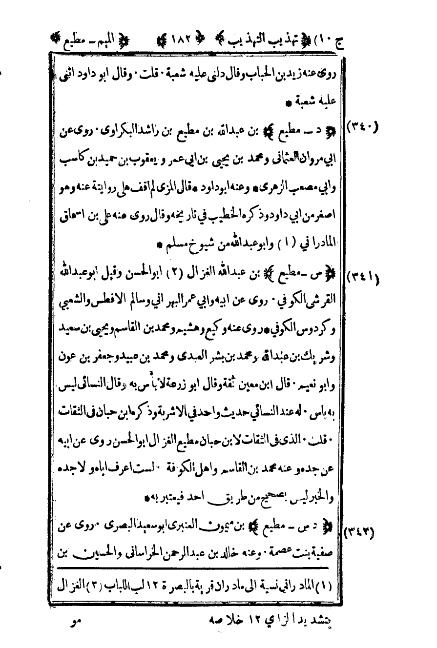 340- "د – مطيع" بن عبد الله بن مطيع بن راشد البكراوي روى عن أبي مروان العثماني ومحمد بن يحيى بن أبي عمر ويعقوب بن حميد بن كاسب وأبي مصعب الزهري وعنه أبو داود قال المزي لم أقف على روايته عنه وهو أصغر من أبي داود وذكره الخطيب في تاريخه وقال روى عنه علي بن إسحاق المادراني1 وأبو عبد الله من شيوخ مسلم.