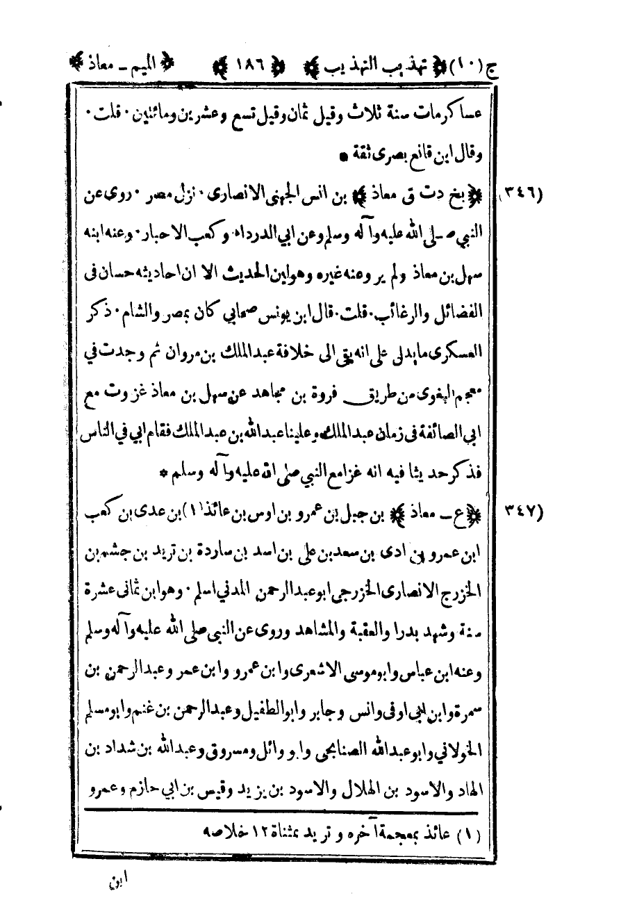 347- "ع – معاذ" بن جبل بن عمرو بن أوس بن عائذ بن عدي بن كعب بن عمرو بن أدي بن سعد بن علي بن أسد بن ساردة بن تريد بن جشم بن الخزرج الأنصاري الخزرجي أبو عبد الرحمن المدني أسلم وهو بن ثماني عشرة سنة وشهد بدرا والعقبة والمشاهد وروى عن النبي صلى الله عليه وسلم وعنه بن عباس وأبو موسى الأشعري وابن عمرو وابن عمر وعبد الرحمن بن سمرة وابن أبي أوفي وأنس وجابر وأبو الطفيل وعبد الرحمن بن غنم وأبو مسلم الخولاني وأبو عبد الله الصنابحي وأبو وائل ومسروق وعبد الله بن شداد بن الهاد والأسود بن الهلال والأسود بن يزيد وقيس بن أبي حازم وعمرو