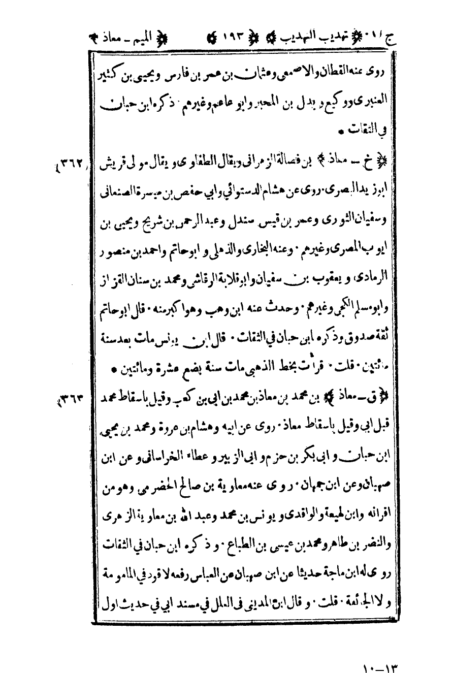 363- "ق – معاذ" بن محمد بن معاذ بن محمد بن أبي بن كعب وقيل بإسقاط محمد قبل أبي وقيل بإسقاط معاذ روى عن أبيه وهشام بن عروة ومحمد بن يحيى بن حبان وأبي بكر بن حزم وأبي الزبير وعطاء الخراساني وعن بن صهبان وعن بن جمهان روى عنه معاوية بن صالح الحضرمي وهو من أقرانه وابن لهيعة والواقدي ويونس بن محمد وعبد الله بن معاوية الزهري والنضر بن طاهر ومحمد بن عيسى بن الطباع وذكره بن حبان في الثقات روى له بن ماجة حديثا عن بن صهبان عن العباس رفعه لا قود في المأمومة ولا الجائفة قلت وقال بن المديني في العلل في مسند أبي في حديث أول