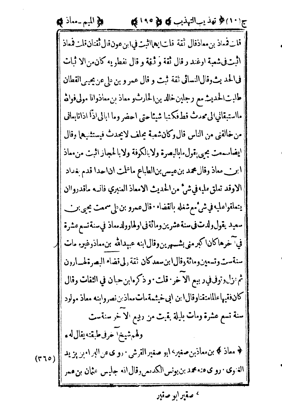 365 – "معاذ" بن معاذ بن صغير1 أبو صغير القرشي روى عن البراء بن يزيد الغنوي روى عنه محمد بن يونس الكديمي وقال أنه جليس عثمان بن عمر