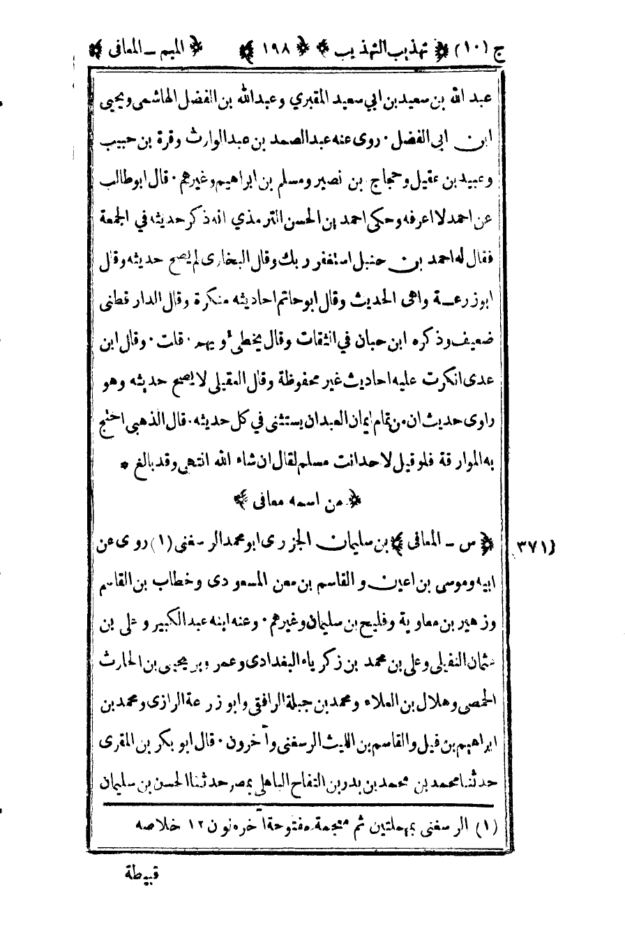371- "س – المعافى" بن سليمان الجزري أبو محمد الرسغني1 روى عن أبيه وموسى بن أعين والقاسم بن معن المسعودي وخطاب بن القاسم وزهير بن معاوية وفليح بن سليمان وغيرهم وعنه ابنه عبد الكبير وعلي بن عثمان النفيلي وعلي بن محمد بن زكريا البغدادي وعمرو بن يحيى بن الحارث الحمصي وهلال بن العلاء ومحمد بن جبلة الرافقي وأبو زرعة الرازي ومحمد بن إبراهيم بن فيل والقاسم بن الليث الرسغني وآخرون قال أبو بكر بن المقري حدثنا محمد بن محمد بن بدر بن التفاح الباهلي بمصر حدثنا الحسن بن سليمان
