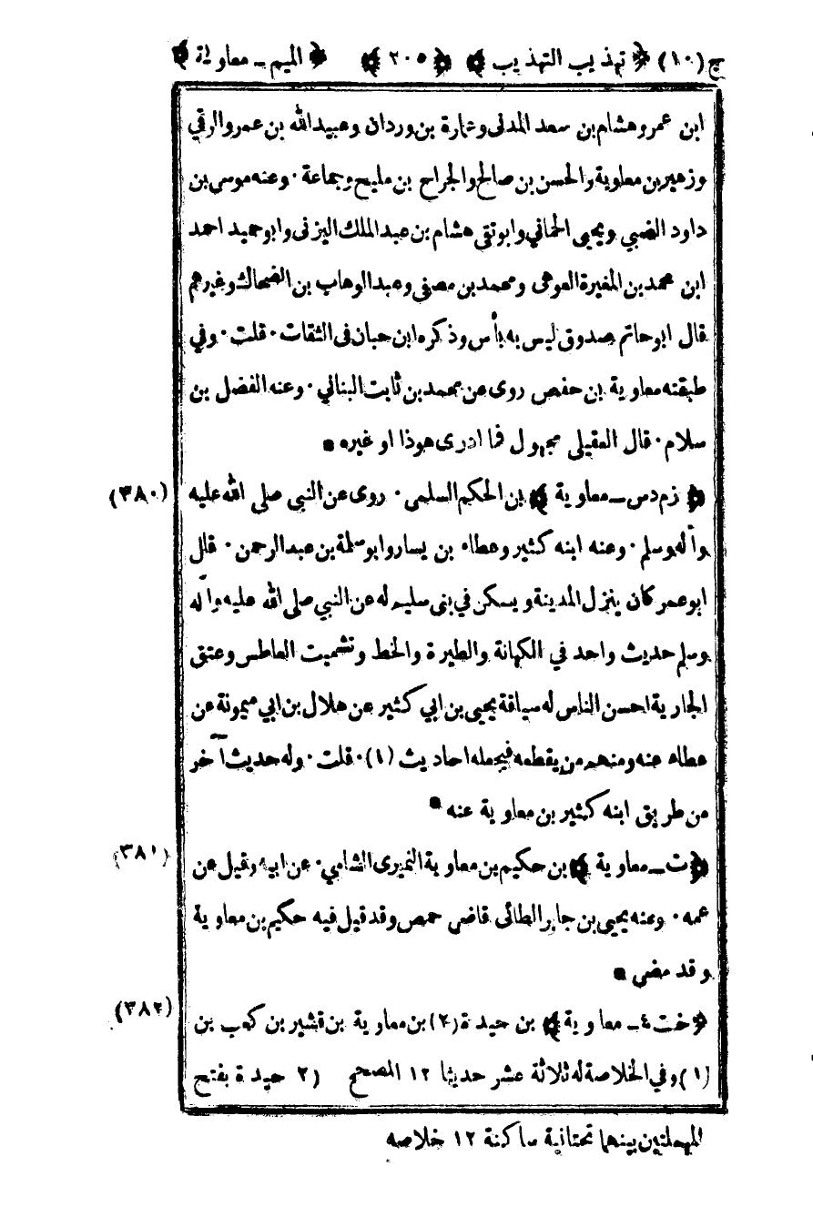 381- "ت – معاوية" بن حكيم بن معاوية النميري الشامي عن أبيه وقيل عن عمه وعنه يحيى بن جابر الطائي قاضي حمص وقد قيل فيه حكيم بن معاوية وقد مضى.