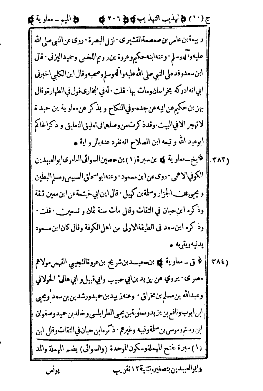 383 – "بخ – معاوية" بن سبرة1بن حصين السوائي العامري أبو العبيدين الكوفي الأعمى روى عن بن مسعود وعنه أبو إسحاق السبيعي ومسلم البطين ويحيى بن الجزار وسلمة بن كهيل قال بن أبي خيثمة عن بن معين ثقة وذكره ابن حبان في الثقات وقال مات سنة ثمان وتسعين قلت وذكره بن سعد في الطبقة الأولى من أهل الكوفة وقال كان بن مسعود يدنيه ويقربه.