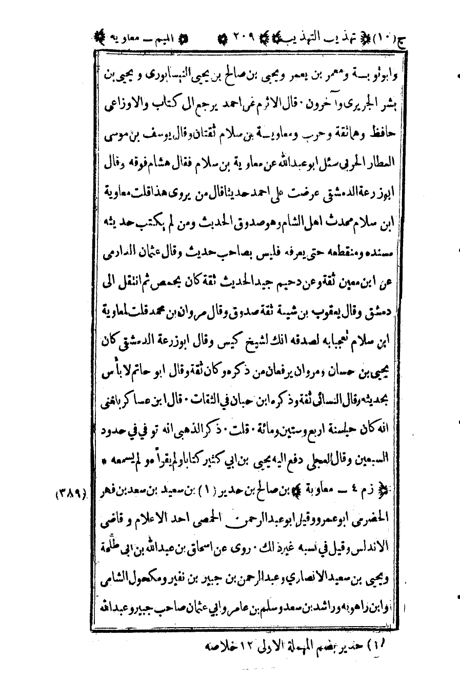 389- "ز م 4 – معاوية" بن صالح بن حدير1 بن سعيد بن سعد بن فهر الحضرمي أبو عمرو وقيل أبو عبد الرحمن الحمصي أحد الأعلام وقاضي الأندلس وقيل في نسبه غير ذلك روى عن إسحاق بن عبد الله بن أبي طلحة ويحيى بن سعيد الأنصاري وعبد الرحمن بن جبير بن نفير ومكحول الشامي وابن راهويه وراشد بن سعد وسلم بن عامر وأبي عثمان صاحب جبير وعبد الله