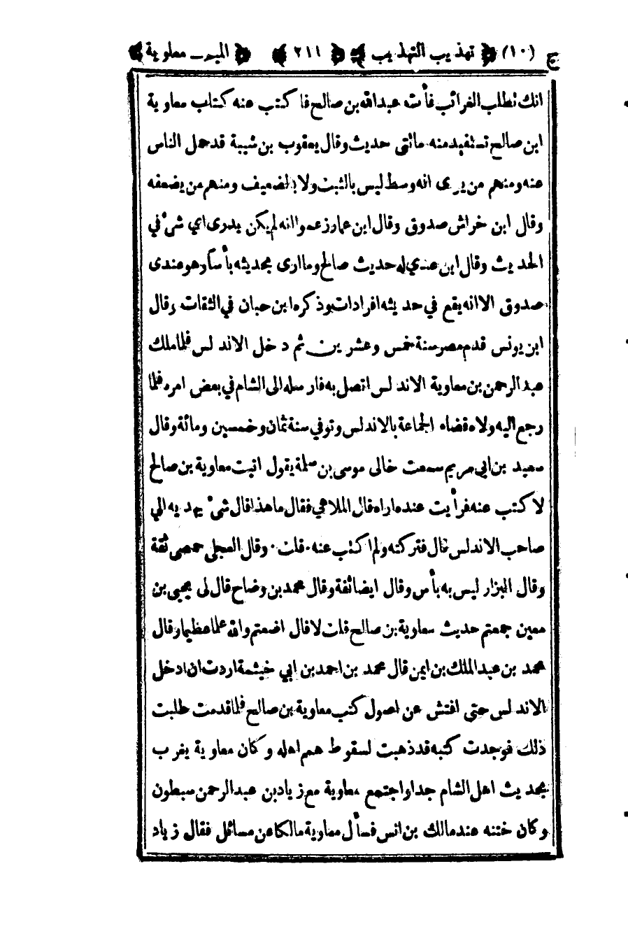 انك تطلب الغرائب فأت عبد الله بن صالح فاكتب عنه كتاب معاوية بن صالح تستفيد منه مائتي حديث وقال يعقوب بن شيبة قد حمل الناس عنه ومنهم من يرى أنه وسط ليس بالثبت ولا بالضعيف ومنهم من يضعفه وقال ابن خراش صدوق وقال بن عمار زعموا أنه لم يكن يدري أي شيء في الحديث وقال بن عدي له حديث صالح وما أرى بحديثه بأسا وهو عندي صدوق إلا أنه يقع في حديثه إفرادات وذكره ابن حبان في الثقات وقال ابن يونس قدم مصر سنة خمس وعشرين ثم دخل الأندلس فلما ملك عبد الرحمن بن معاوية الأندلس اتصل به فأرسله إلى الشام في بعض أمره فلما رجع إليه ولاه قضاء الجماعة بالأندلس وتوفي سنة ثمان وخمسين ومائة وقال سعيد بن أبي مريم سمعت خالي موسى بن سلمة يقول أتيت معاوية بن صالح لاكتب عنه فرأيت عنده أراه قال الملاهي فقال ما هذا قال شيء يهديه إلي صاحب الأندلس قال فتركته ولم اكتب عنه قلت وقال العجلي حمصي ثقة وقال البزار ليس به بأس وقال أيضا ثقة وقال محمد بن وضاح قال لي يحيى بن معين جمعتم حديث معاوية بن صالح قلت لا قال أضعتم والله علما عظيما وقال محمد بن عبد الملك بن أيمن قال محمد بن أحمد بن أبي خيثمة أردت أن أدخل الأندلس حتى افتش عن أصول كتب معاوية بن صالح فلما قدمت طلبت ذلك فوجدت كتبه قد ذهبت لسقوط همم أهله وكان معاوية يغرب بحديث أهل الشام جدا واجتمع معاوية مع زياد بن عبد الرحمن سبطون وكان ختنه عند مالك بن أنس فسأل معاوية مالكا عن مسائل فقال زياد