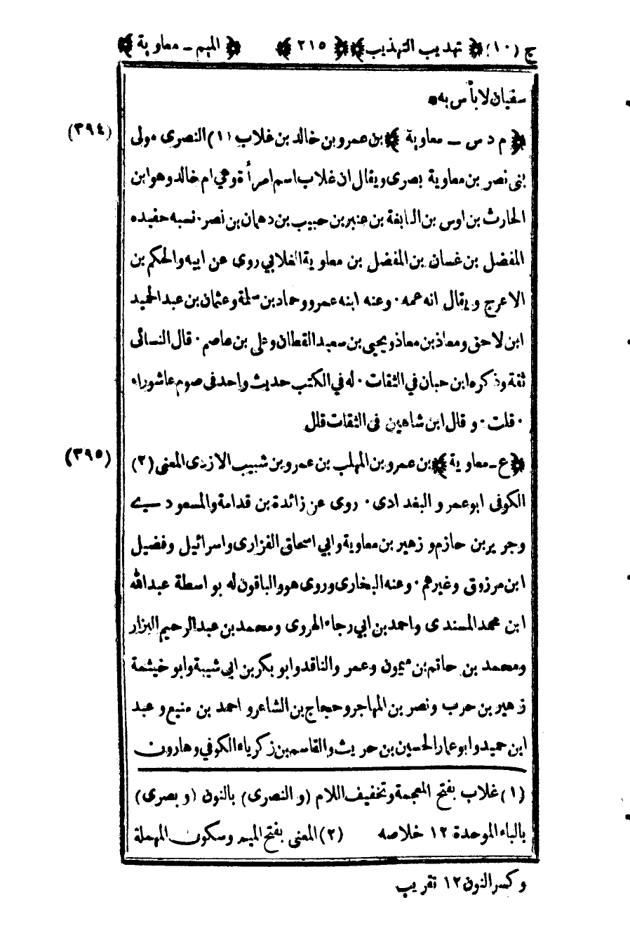 395 – "ع – معاوية" بن عمرو بن المهلب بن عمرو بن شبيب الأزدي المعني2 الكوفي أبو عمرو البغدادي روى عن زائدة بن قدامة والمسعودي وجرير بن حازم وزهير بن معاوية وأبي إسحاق الفزاري وإسرائيل وفضيل بن مرزوق وغيرهم وعنه البخاري وروى هو والباقون له بواسطة عبد الله بن محمد المسندي وأحمد بن أبي رجاء الهروي ومحمد بن عبد الرحيم البزار ومحمد بن حاتم بن ميمون وعمرو الناقد وأبو بكر بن أبي شيبة وأبو خيثمة زهير بن حرب ونصر بن المهاجر وحجاج بن الشاعر وأحمد بن منيع وعبد بن حميد وأبو عمار الحسين بن حريث والقاسم بن زكريا الكوفي وهارون