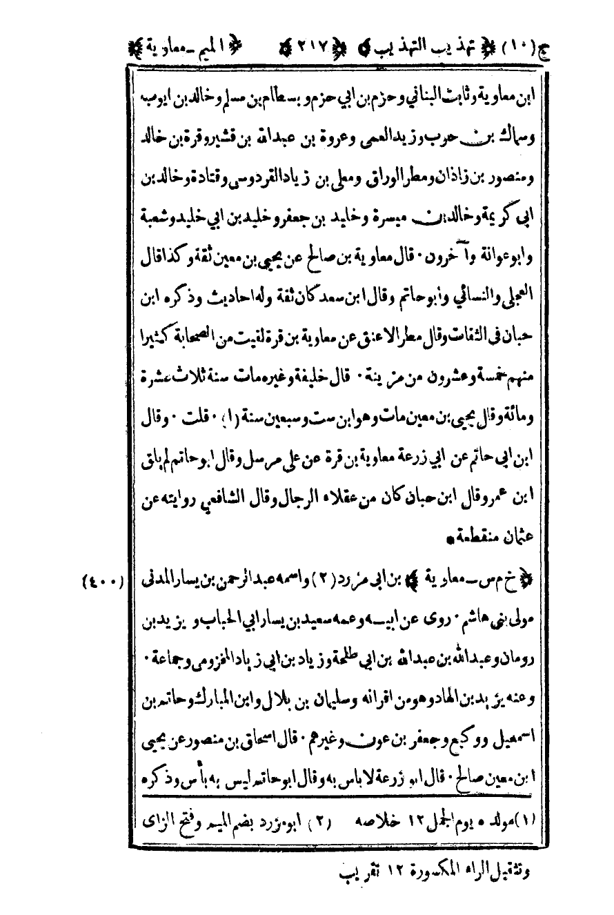 400- "خ م س – معاوية" بن أبي مزرد2 واسمه عبد الرحمن بن يسار المدني مولى بني هشام روى عن أبيه وعمه سعيد بن يسار أبي الحباب ويزيد بن رومان وعبد الله بن عبد الله بن أبي طلحة وزياد بن أبي زياد المخزومي وجماعة وعنه يزيد بن الهاد وهو من أقرانه وسليمان بن بلال وابن المبارك وحاتم بن إسماعيل ووكيع وجعفر بن عون وغيرهم قال إسحاق بن منصور عن يحيى بن معين صالح قال أبو زرعة لا بأس به وقال أبو حاتم ليس به بأس وذكره