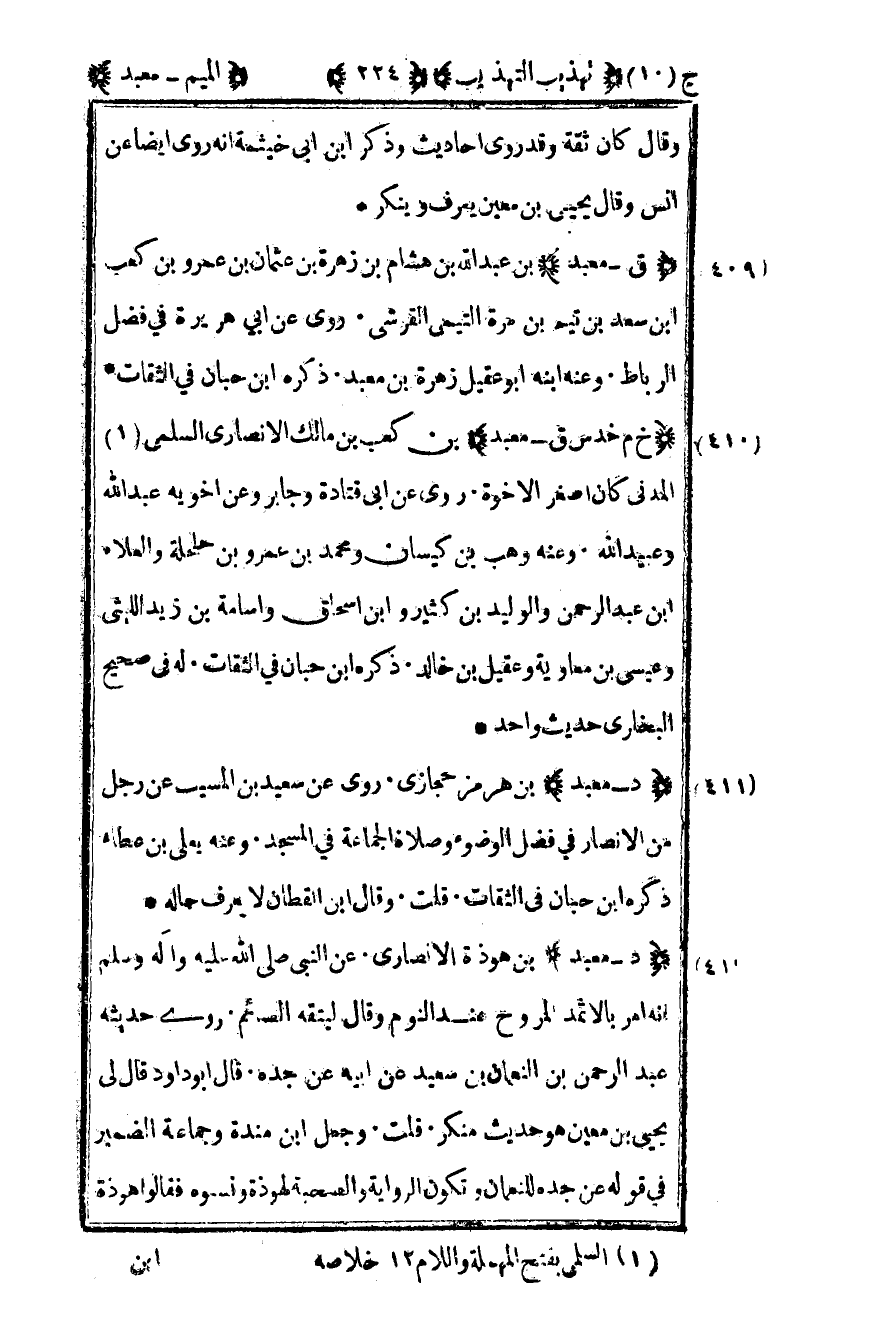 410 – "خ م خد س ق – معبد" بن كعب بن مالك الأنصاري السلمي1 المدني كان أصغر الأخوة روى عن أبي قتادة وجابر وعن أخويه عبد الله وعبيد الله وعنه وهب بن كيسان ومحمد بن عمرو بن حلحلة والعلاء بن عبد الرحمن والوليد بن كثير وابن إسحاق وأسامة بن زيد الليثي وعيسى بن معاوية وعقيل بن خالد ذكره بن حبان في الثقات له في صحيح البخاري حديث واحد.