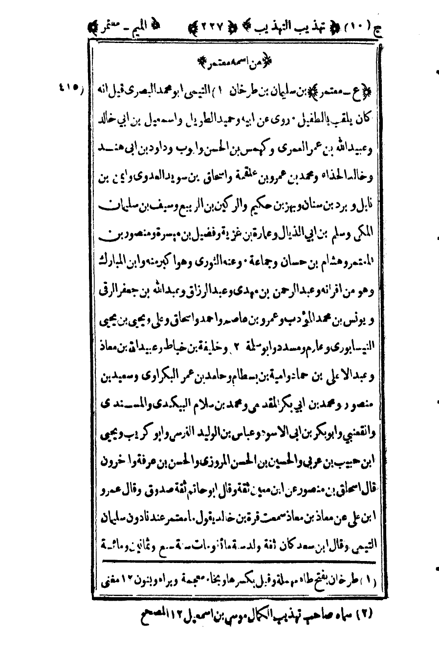 415- "ع – معتمر" بن سليمان بن طرخان1 التيمي أبو محمد البصري قيل أنه كان يلقب بالطفيل روى عن أبيه وحميد الطويل وإسماعيل بن أبي خالد وعبيد الله بن عمر العمري وكهمس بن الحسن وأيوب وداود بن أبي هند وخالد الحذاء ومحمد بن عمرو بن علقمة وإسحاق بن سويد العدوي وأيمن بن نابل وبرد بن سنان وبهز بن حكيم والركين بن الربيع وسيف بن سليمان المكي وسلم بن أبي الذيال وعمارة بن غزية وفضيل بن ميسرة ومنصور بن المعتمر وهشام بن حسان وجماعة وعنه الثوري وهو أكبر منه وابن المبارك وهو من أقرانه وعبد الرحمن بن مهدي وعبد الرزاق وعبد الله بن جعفر الرقي ويونس بن محمد المؤدب وعمر بن عاصم وأحمد وإسحاق وعلي ويحيى بن يحيى النيسابوري وعارم ومسدد وأبو سلمة2 وخليفة بن خياط وعبيد الله بن معاذ وعبد الأعلى بن حماد وأمية بن بسطام وحامد بن عمر البكراوي وسعيد بن منصور ومحمد بن أبي بكر المقدمي ومحمد بن سلام البيكندي والمسندي والقعنبي وأبو بكر بن الأسود وعباس بن أبي الوليد النرسي وأبو كريب ويحيى بن حبيب بن عربي والحسين بن الحسن المروزي والحسن بن عرفة وآخرون قال إسحاق بن منصور عن بن معين ثقة وقال أبو حاتم ثقة صدوق وقال عمر بن علي عن معاذ بن معاذ سمعت قرة بن خالد يقول ما معتمر عندنا دون سليمان التيمي وقال بن سعد كان ثقة ولد سنة ولد سنة مائة ومات سنة سبع وثمانين ومائة