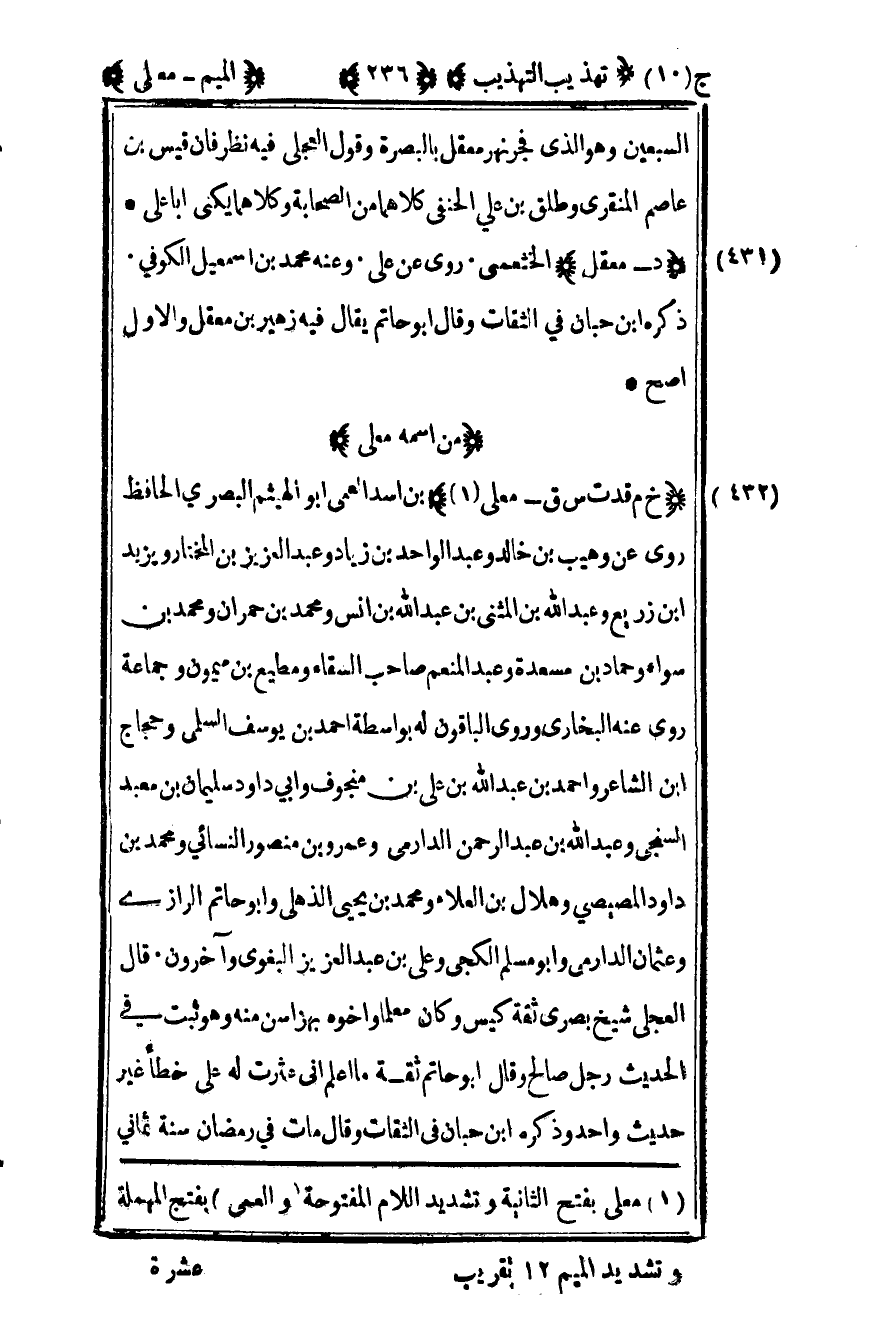 432- "خ م قد ت س ق – معلى1" بن أسد العمي أبو الهيثم البصري الحافظ روى عن وهيب بن خالد وعبد الواحد بن زياد وعبد العزيز بن المختار ويزيد بن زريع وعبد الله بن المثنى بن عبد الله بن أنس ومحمد بن حمران ومحمد بن سواء وحماد بن مسعدة وعبد المنعم صاحب السقاء ومطيع بن ميمون وجماعة روى عنه البخاري وروى الباقون له بواسطة أحمد بن يوسف السلمي وحجاج بن الشاعر وأحمد بن عبد الله بن علي بن منجوف وأبي داود سليمان بن معبد السنجي وعبد الله بن عبد الرحمن الدارمي وعمرو بن منصور النسائي ومحمد بن داود المصيصي وهلال بن العلاء ومحمد بن يحيى الذهلي وأبو حاتم الرازي وعثمان الدارمي وأبو مسلم الكجي وعلي بن عبد العزيز البغوي وآخرون قال العجلي شيخ بصري ثقة كيس وكان معلما وأخوه بهز أسن منه وهو ثبت في الحديث رجل صالح وقال أبو حاتم ثقة ما أعلم أني عثرت له على خطأ غير حديث واحد وذكره بن حبان في الثقات وقال مات في رمضان سنة ثماني