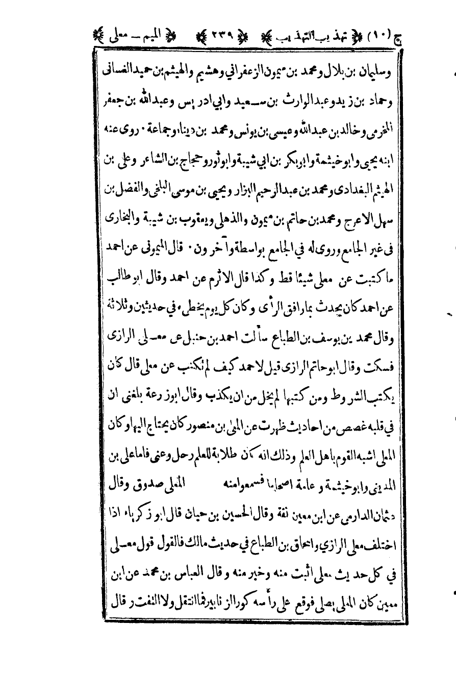 وسليمان بن بلال ومحمد بن ميمون الزعفراني وهشيم والهيثم بن حميد الغساني وحماد بن زيد وعبد الوارث بن سعيد وأبي إدريس وعبد الله بن جعفر المخرمي وخالد بن عبد الله وعيسى بن يونس ومحمد بن دينار وجماعة روى عنه ابنه يحيى وأبو خيثمة وأبو بكر بن أبي شيبة وأبو ثور وحجاج بن الشاعر وعلي بن الهيثم البغدادي ومحمد بن عبد الرحيم البزار ويحيى بن موسى البلخي والفضل بن سهل الأعرج ومحمد بن حاتم بن ميمون والذهلي ويعقوب بن شيبة والبخاري في غير الجامع وروى له في الجامع بواسطة وآخرون قال الميموني عن أحمد ما كتبت عن معلى شيئا قط وكذا قال الأثرم عن أحمد وقال أبو طالب عن أحمد كان يحدث بما وافق الرأي وكان كل يوم يخطئ في حديثين وثلاثة وقال محمد بن يوسف بن الطباع سألت أحمد بن حنبل عن معلى الرازي فسكت وقال أبو حاتم الرازي قيل لأحمد كيف لم تكتب عن معلى قال كان يكتب الشروط ومن كتبها لم يخل من أن يكذب وقال أبو زرعة بلغني أن في قلبه غصص من أحاديث ظهرت عن المعلى بن منصور كان يحتاج إليها وكان المعلى أشبه القوم بأهل العلم وذلك أنه كان طلابة للعلم رحل وعني فأما علي بن المديني وأبو خيثمة وعامة أصحابه فسمعوا منه المعلى صدوق وقال عثمان الدارمي عن ابن معين ثقة وقال الحسين بن حيان قال أبو زكريا إذا اختلف معلى الرازي وإسحاق بن الطباع في حديث مالك فالقول قول معلى في كل حديث معلى أثبت منه وخير منه وقال العباس بن محمد عن ابن معين كان المعلى يصلي فوقع على رأسه كور الزنابير فما انتقل ولا التفت وقال