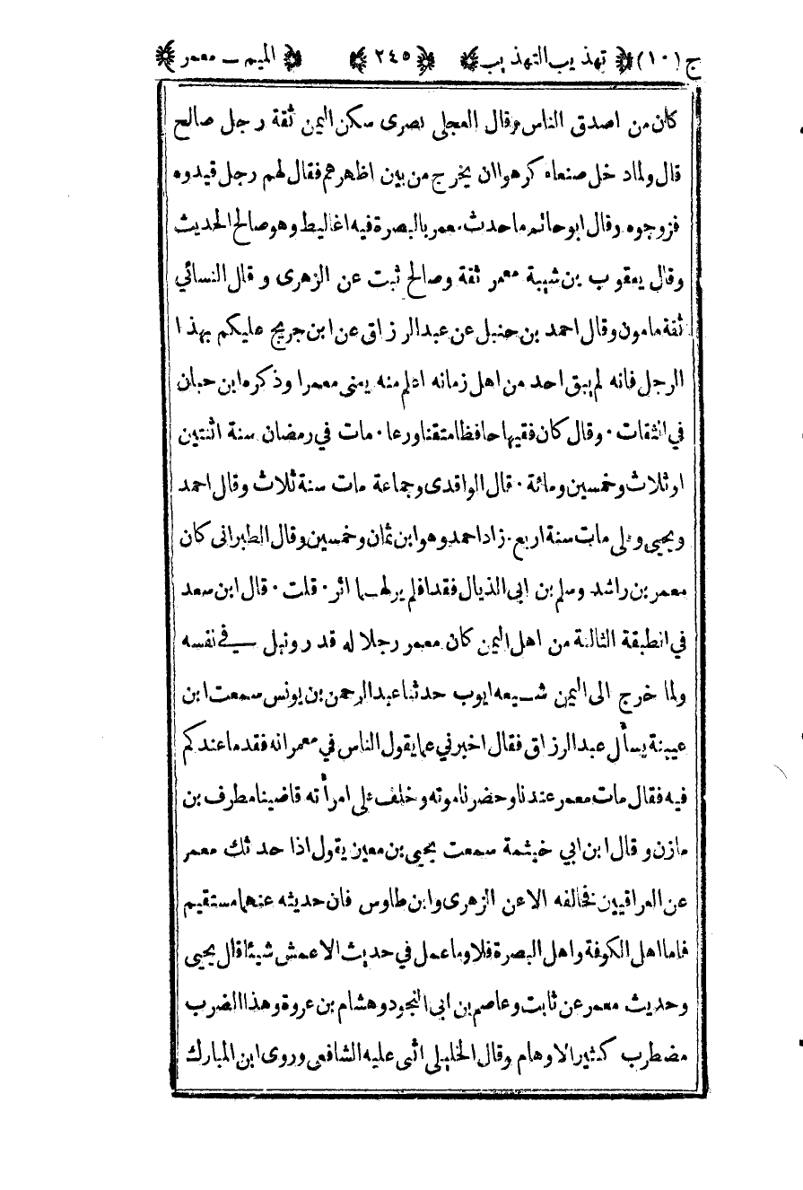 كان من أصدق الناس وقال العجلي بصري سكن اليمن ثقة رجل صالح قال ولما دخل صنعاء كرهوا أن يخرج من بين أظهرهم فقال لهم رجل قيدوه فزوجوه وقال أبو حاتم ما حدث معمر بالبصرة فيه أغاليط وهو صالح الحديث وقال يعقوب بن شيبة معمر ثقة وصالح ثبت عن الزهري وقال النسائي ثقة مأمون وقال أحمد بن حنبل عن عبد الرزاق عن بن جريج عليكم بهذا الرجل فإنه لم يبق أحد من أهل زمانه أعلم منه يعني معمرا وذكره بن حبان في الثقات وقال كان فقيها حافظا متقنا ورعا مات في رمضان سنة اثنتين أو ثلاث وخمسين ومائة قال الواقدي وجماعة مات سنة ثلاث وقال أحمد ويحيى وعلي مات سنة أربع زاد أحمد وهو بن ثمان وخمسين وقال الطبراني كان معمر بن راشد وسلم بن أبي الذيال فقدا فلم ير لهما أثر قلت قال بن سعد في الطبقة الثالثة من أهل اليمن كان معمر رجلا له قدر ونبل في نفسه ولما خرج إلى اليمن شيعه أيوب حدثنا عبد الرحمن بن يونس سمعت بن عيينة يسأل عبد الرزاق فقال أخبرني عما يقول الناس في معمر أنه فقد ما عندكم فيه فقال مات معمر عندنا وحضرنا موته وخلف على امرأته قاضينا مطرف بن مازن وقال بن أبي خيثمة سمعت يحيى بن معين يقول إذا حدثك معمر عن العراقيين فخالفه إلا عن الزهري وابن طاوس فإنه حديثه عنهما مستقيم فأما أهل الكوفة وأهل البصرة فلا وما عمل في حديث الأعمش شيئا قال يحيى وحديث معمر عن ثابت وعاصم بن أبي النجود وهشام بن عروة وهذا الضرب مضطرب كثير الأوهام وقال الخليلي أثنى عليه الشافعي وروى ابن المبارك