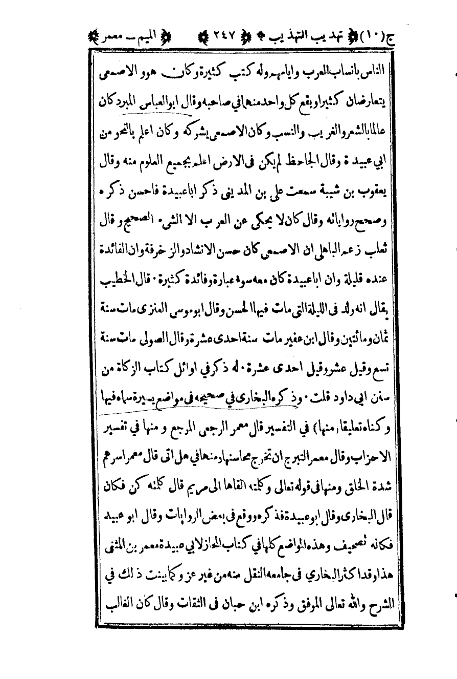 الناس بانساب العرب وايامهم وله كتب كثيرة وكان هو والأصمعي يتعارضان كثيرا ويقع كل واحد منهما في صاحبه وقال أبو العباس كان عالما بالشعر والغريب والنسب وكان الأصمعي يشركه وكان أعلم بالنحو من أبي عبيدة وقال الجاحظ لم يكن في الأرض أعلم بجميع العلوم منه وقال يعقوب بن شيبة سمعت علي بن المديني ذكر أبا عبيدة فأحسن ذكره وصحح رواياته وقال كان لا يحكي عن العرب إلا الشيء الصحيح وقال ثعلب زعم الباهلي أن الأصمعي كان حسن الانشاد والزخرفة وأن الفائدة عنده قليلة وأن أبا عبيدة كان معه سوء عبارة وفائدة كثيرة قال الخطيب يقال أنه ولد في الليلة التي مات فيها الحسن وقال أبو موسى العنزي مات سنة ثمان ومائتين وقال بن عفير مات سنة إحدى عشرة وقال الصولي مات سنة تسع وقيل عشر وقيل إحدى عشرة له ذكر في أوائل كتاب الزكاة من سنن أبي داود قلت وذكره البخاري في صحيحه في مواضع يسيرة سماه فيها وكناه تعليقا منها في التفسير قال معمر الرجعي المرجع ومنها في تفسير الأحزاب وقال معمر التبرج أن تخرج محاسنها ومنها في هل أتى قال معمر أسرهم شدة الخلق ومنها في قوله تعالى: {وَكَلِمَتُهُ أَلْقَاهَا إِلَى مَرْيَمَ} قال كلمته كن فكان قال البخاري وقال أبو عبيدة فذكره ووقع في بعض الروايات وقال أبو عبيد فكأنه تصحيف وهذه المواضع كلها في كتاب المحاز لأبي عبيدة معمر بن المثنى هذا وقد أكثر البخاري في جامعه النقل منه من غير عزو كما بينت ذلك في الشرح والله تعالى الموفق وذكره ابن حبان في الثقات وقال كان الغلب