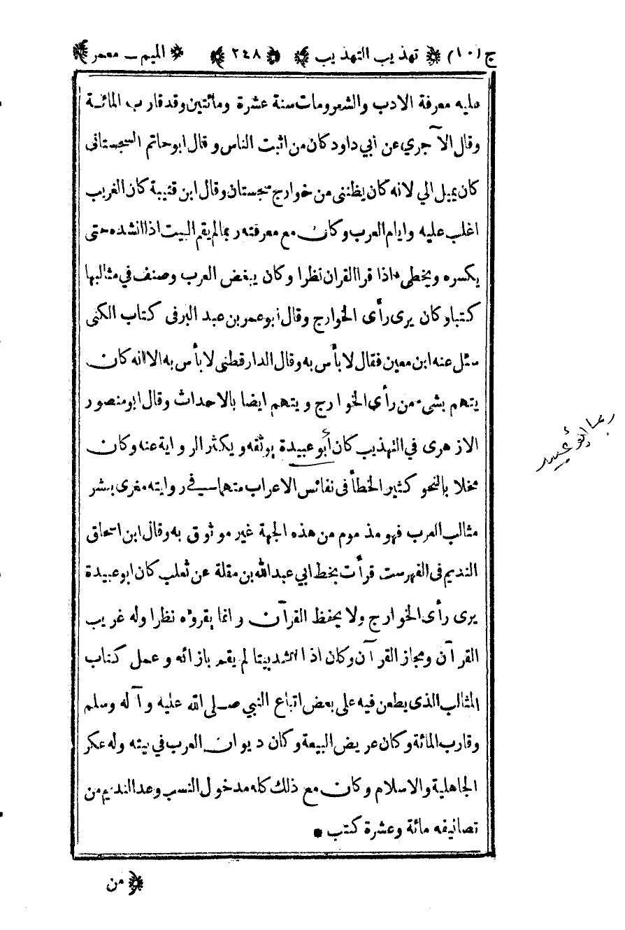 عليه معرفة الأدب والشعر ومات سنة عشرة ومائتين وقد قارب المائة وقال الآجري عن أبي داود كان من أثبت الناس وقال أبو حاتم السجستاني كان يميل إلى لأنه كان يظنني من خوارج سجستان وقال بن قتيبة كان الغريب أغلب عليه وأيام العرب وكان مع معرفته ربما لم يقم البيت إذا أنشده حتى يكسره ويخطئ إذا قرأ القرآن نظرا وكان يبغض العرب وصنف في مثالبها كتبا وكان يرى رأي الخوارج وقال أبو عمر بن عبد البر في كتاب الكنى سئل عنه بن معين فقال لا بأس به وقال الدارقطني لا بأس به إلا أنه كان يتهم بشيء من رأي الخوارج ويتهم أيضا بالأحداث وقال أبو منصور الأزهري في التهذيب كان أبو عبيدة يوثقه ويكثر الرواية عنه وكان مخلا بالنحو كثير الخطأ في نفائس الأعراب متهما في روايته مغرى بشر مثالب العرب فهو مذموم من هذه الجهة غير موثوق به وقال بن إسحاق النديم في الفهرست قرأت بخط أبي عبد الله بن مقلة عن ثعلب كان أبو عبيدة يرى رأي الخوارج ولا يحفظ القرآن وإنما يقرؤه نظرا وله غريب القرآن ومجاز القرآن وكان إذا أنشد بيتا لم يقم بإزائه وعمل كتاب المثالب الذي يطعن فيه على بعض أتباع النبي صلى الله عليه وسلم وقارب المائة وكان عريض البيعة وكان ديوان العرب في بيته وله عكر الجاهلية والإسلام وكان مع ذلك كله مدخول النسب وعد النديم من تصانيفه مائة وعشرة كتب.
