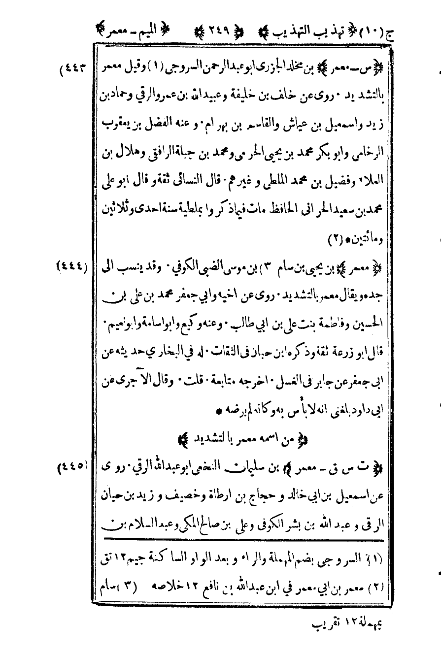 443 – "س – معمر" بن مخلد الجزري أبو عبد الرحمن السروجي1 وقيل معمر بالتشديد روى عن خلف بن خليفة وعبيد الله بن عمرو الرقي وحماد بن زيد وإسماعيل بن عياش والقاسم بن بهرام وعنه الفضل بن يعقوب الرخامي وأبو بكر محمد بن يحيى الحرمي ومحمد بن جبلة الرافقي وهلال بن العلاء فضيل بن محمد الملطي وغيرهم قال النسائي ثقة وقال أبو علي محمد بن سعيد الحراني الحافظ مات فيما ذكروا بملطية سنة إحدى وثلاثين ومائتين2.