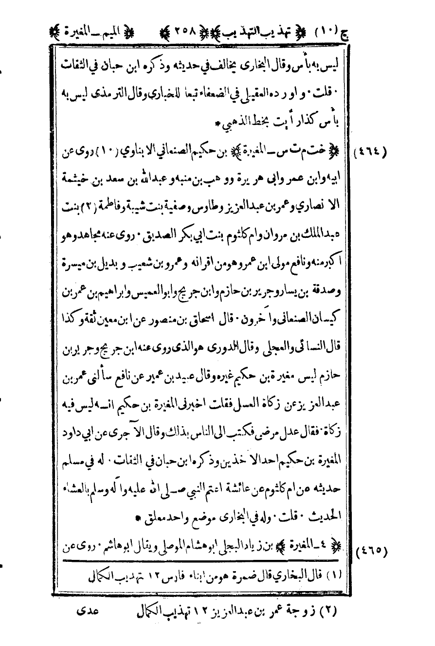464 – "خت م ت س – المغيرة" بن حكيم الصنعاني الأبناوي1 روى عن أبيه وابن عمر وأبي هريرة ووهب بن منبه وعبد الله بن سعد بن خيثمة الأنصاري وعمر بن عبد العزيز وطاووس وصفية بنت شيبة وفاطمة2 بنت عبد الملك بن مروان وأم كلثوم بنت أبي بكر الصديق روى عنه مجاهد وهو أكبر منه ونافع مولى بن عمر وهو من أقرانه وعمرو بن شعيب وبديل بن ميسرة وصدقة بن يسار وجرير بن حازم وابن جريج وأبو العميس وإبراهيم بن عمر بن كيسان الصنعاني وآخرون قال إسحاق بن منصور عن بن معين ثقة وكذا قال النسائي والعجلي وقال الدوري هو الذي روى عنه ابن جريج وجرير بن حازم ليس مغيرة بن حكيم غيره وقال عبيد بن عمير عن نافع سألني عمر بن عبد العزيز عن زكاة العسل فقلت أخبرني المغيرة بن حكيم أنه ليس فيه زكاة فقال عدل مرضي فكتب إلى الناس بذلك وقال الآجري عن أبي داود المغيرة بن حكيم أحد الآخرين وذكره بن حبان في الثقات له في مسلم حديثه عن أم كلثوم عن عائشة أعتم النبي صلى الله عليه وسلم بالعشاء الحديث قلت وله في البخاري موضع واحد معلق.