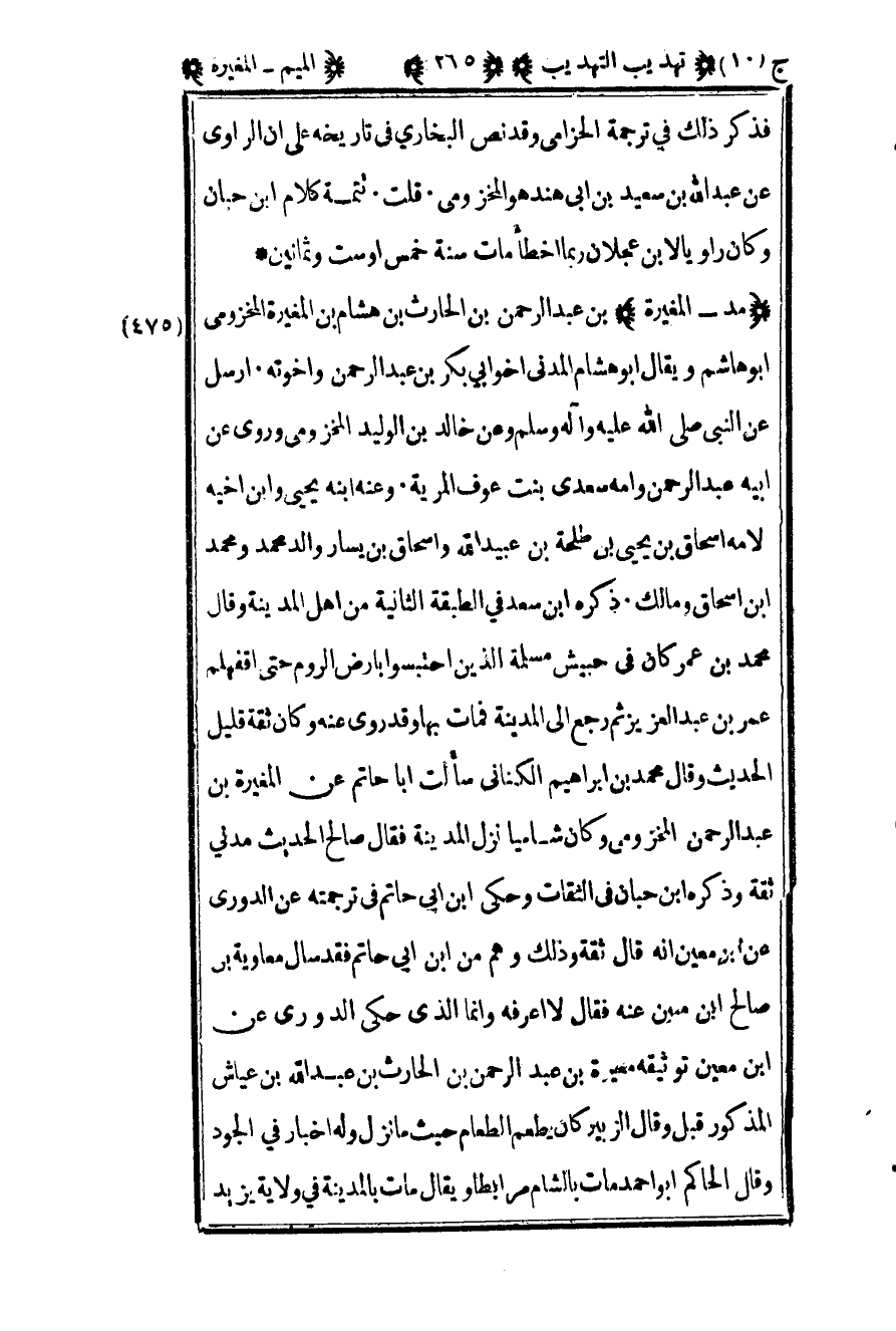 475 – "مد – المغيرة" بن عبد الرحمن بن الحارث بن هشام بن المغيرة المخزومي أبو هاشم ويقال أبو هشام المدني أخو أبي بكر بن عبد الرحمن وإخوته أرسل عن النبي صلى الله عليه وسلم وعن خالد بن الوليد المخزومي وروى عن أبيه عبد الرحمن وأمه سعدى بنت عوف المرية وعنه ابنه يحيى وابن أخيه لأمه إسحاق بن يحيى بن طلحة بن عبيد الله وإسحاق بن يسار والد محمد ومحمد بن إسحاق ومالك ذكره بن سعد في الطبقة الثانية من أهل المدينة وقال محمد بن عمر كان في حبيش مسلمة الذين احتبسوا بأرض الروم حتى أقفلهم عمر بن عبد العزيز ثم رجع إلى المدينة فمات بها وقدروى عنه وكان ثقة قليل الحديث وقال محمد بن إبراهيم الكناني سألت أبا حاتم عن المغيرة بن عبد الرحمن المخزومي وكان شاميا نزل المدينة فقال صالح الحديث مدني ثقة وذكره بن حبان في الثقات وحكى ابن أبي حاتم في ترجمته عن الدوري عن بن معين انه قال ثقة وذلك وهم من بن أبي حاتم فقد سأل معاوية بن صالح بن معين عنه فقال لا أعرفه وإنما الذي حكى الدوري عن بن معين توثيقه مغيرة بن عبد الرحمن بن الحارث بن عبد الله بن عياش المذكور قبل وقال الزبير كان يطعم الطعام حيثما نزل وله أخبار في الجود وقال الحاكم أبو أحمد مات بالشام مرابطا ويقال مات بالمدينة في ولاية يزيد