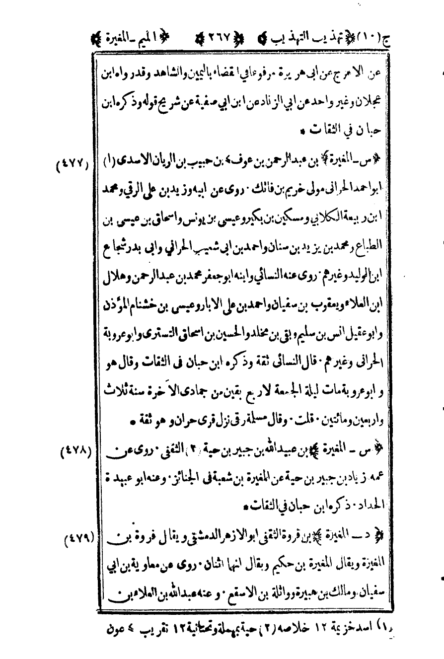 478 – "س – المغيرة" بن عبيد الله بن جبير بن حية2 الثقفي روى عن عمه زياد بن جبير بن حية عن المغيرة بن شعبة في الجنائز وعنه أبو عبيدة الحداد ذكره ابن حبان في الثقات.
