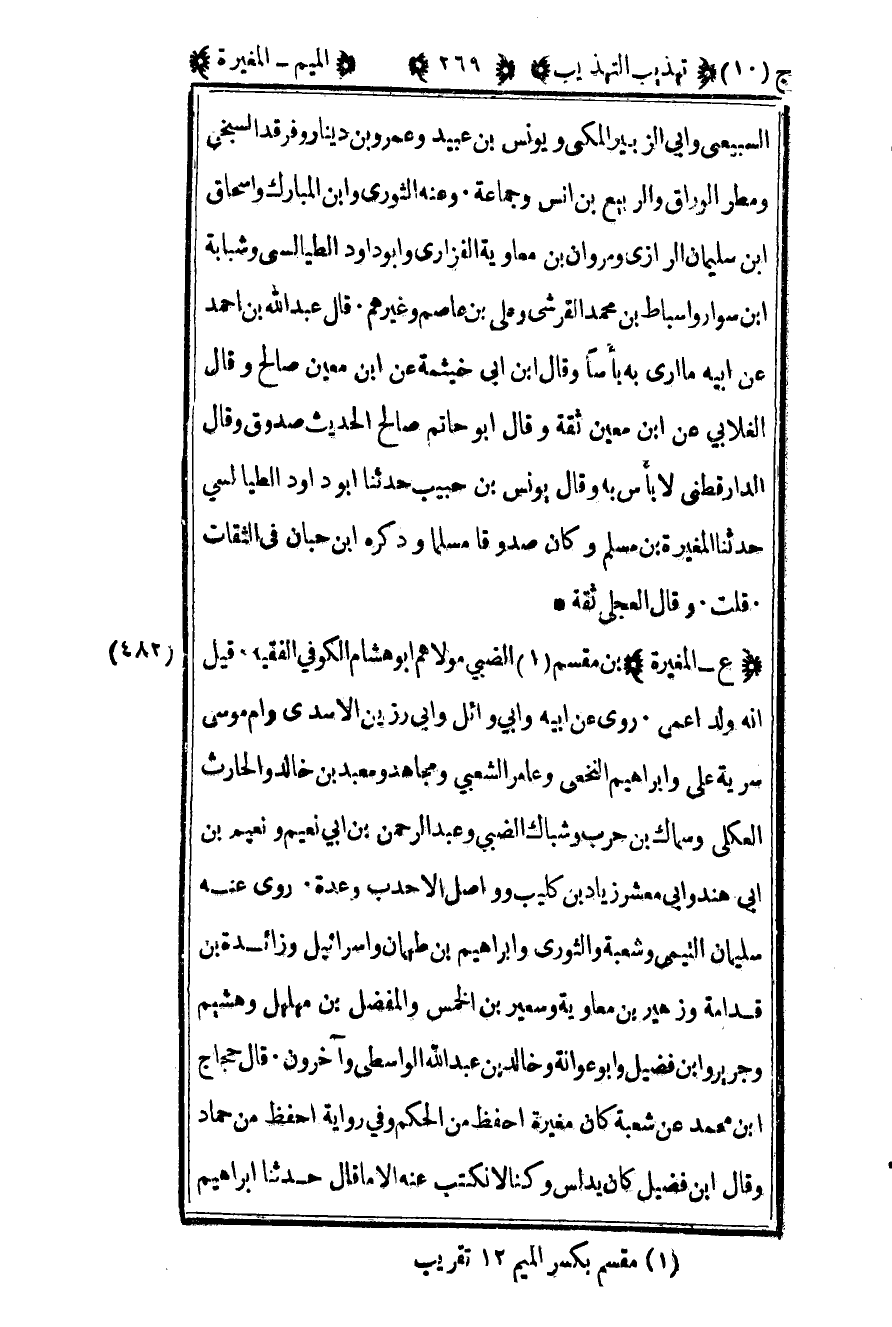 482 – "ع – المغيرة" بن مقسم1 الضبي مولاهم أبو هشام الكوفي الفقيه قيل أنه ولد أعمى روى عن أبيه وأبي وائل وأبي رزين الأسدي وأم موسى سرية علي وإبراهيم النخعي وعامر الشعبي ومجاهد ومعبد بن خالد والحارث العكلي وسماك بن حرب وشباك الضبي وعبد الرحمن بن أبي نعيم ونعيم بن أبي هند وأبي معشر زياد بن كليب وواصل الأحدب وعدة روى عنه سليمان التيمي وشعبة والثوري وإبراهيم بن طهمان وإسرائيل وزائدة بن قدامة وزهير بن معاوية وسعير بن الخمس والمفضل بن مهلهل وهشيم وجرير وابن فضيل وأبو عوانة وخالد بن عبد الله الواسطي وآخرون قال حجاج بن محمد عن شعبة كان مغيرة أحفظ من الحكم وفي رواية أحفظ من حماد وقال بن فضيل كان يدلس وكنا لا نكتب عنه الا ما قال حدثنا إبراهيم