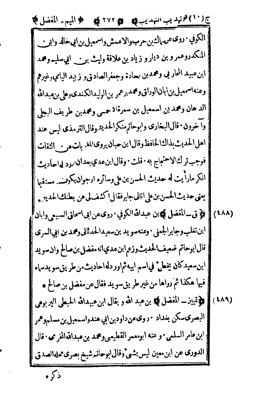 488- "ق – الفضل" بن عبد الله الكوفي روى عن أبي إسحاق السبيعي وأبان بن تغلب وجابر الجعفي وعنه سويد بن سعيد الحدثاني ومحمد بن أبي السري قال أبو حاتم ضعيف الحديث وزعم ابن عدي أنه مفضل بن صالح وأن سويد بن سعيد كان يخطئ في اسم أبيه ثم أورد له أحاديث من طريق سويد سماه فيها هكذا ثم رواها من غير طريق سويد فقال عن مفضل بن صالح.