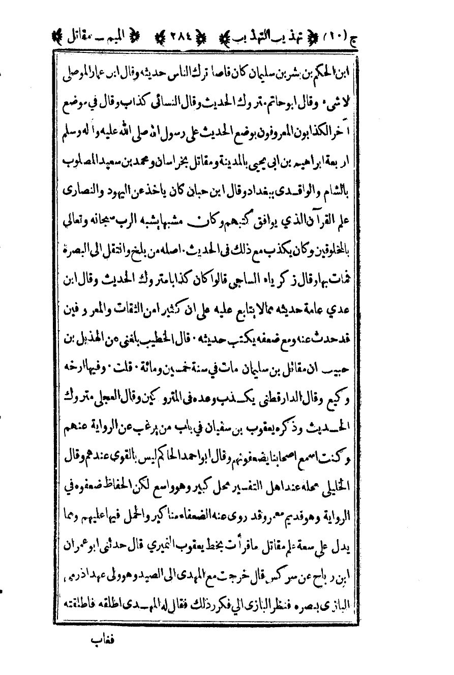 ابن الحكم بن بشر بن سليمان كان قاصا ترك الناس حديثه وقال بن عمار الموصلي لا شيء وقال أبو حاتم متروك الحديث وقال النسائي كذاب وقال في موضع آخر الكذابون المعروفون بوضع الحديث على رسول الله صلى الله عليه وسلم أربعة إبراهيم بن أبي يحيى بالمدينة ومقاتل بخراسان ومحمد بن سعيد المصلوب بالشام والواقدي ببغداد وقال بن حبان كان يأخذ عن اليهود والنصارى علم القرآن الذي يوافق كتبهم وكان مشبها يشبه الرب سبحانه وتعالى بالمخلوقين وكان يكذب مع ذلك في الحديث أصله من بلخ وانتقل إلى البصرة فمات بها وقال زكريا الساجي قالوا كان كذابا متروك الحديث وقال بن عدي عامة حديثه مما لا يتابع عليه على أن كثيرا من الثقات والمعروفين قد حدث عنه ومع ضعفه يكتب حديثه قال الخطيب بلغني عن الهذيل بن حبيب أن مقاتل بن سليمان مات في سنة خمسين ومائة قلت وفيها أرخه وكيع وقال الدارقطني يكذب وعده في المتروكين وقال العجلي متروك الحديث وذكره يعقوب بن سفيان في باب من يرغب عن الرواية عنهم وكنت أسمع أصحابنا وقال أبو أحمد الحاكم ليس بالقوي عندهم وقال الخليلي محله عند أهل التفسير محل كبير وهو واسع لكن الحفاظ ضعفوه في الرواية وهو قديم معمر وقد روى عنه الضعفاء مناكير والحمل فيها عليهم ومما يدل على سعة علم مقاتل ما قرأت بخط يعقوب النميري قال حدثني أبو عمران بن رباح عن سركس قال خرجت مع المهدي إلى الصيد وهو ولي عهد أذرمى البازي ببصرة فنظر البازي إلى فكرر ذلك فقال له المهدي أطلقه فأطلقته