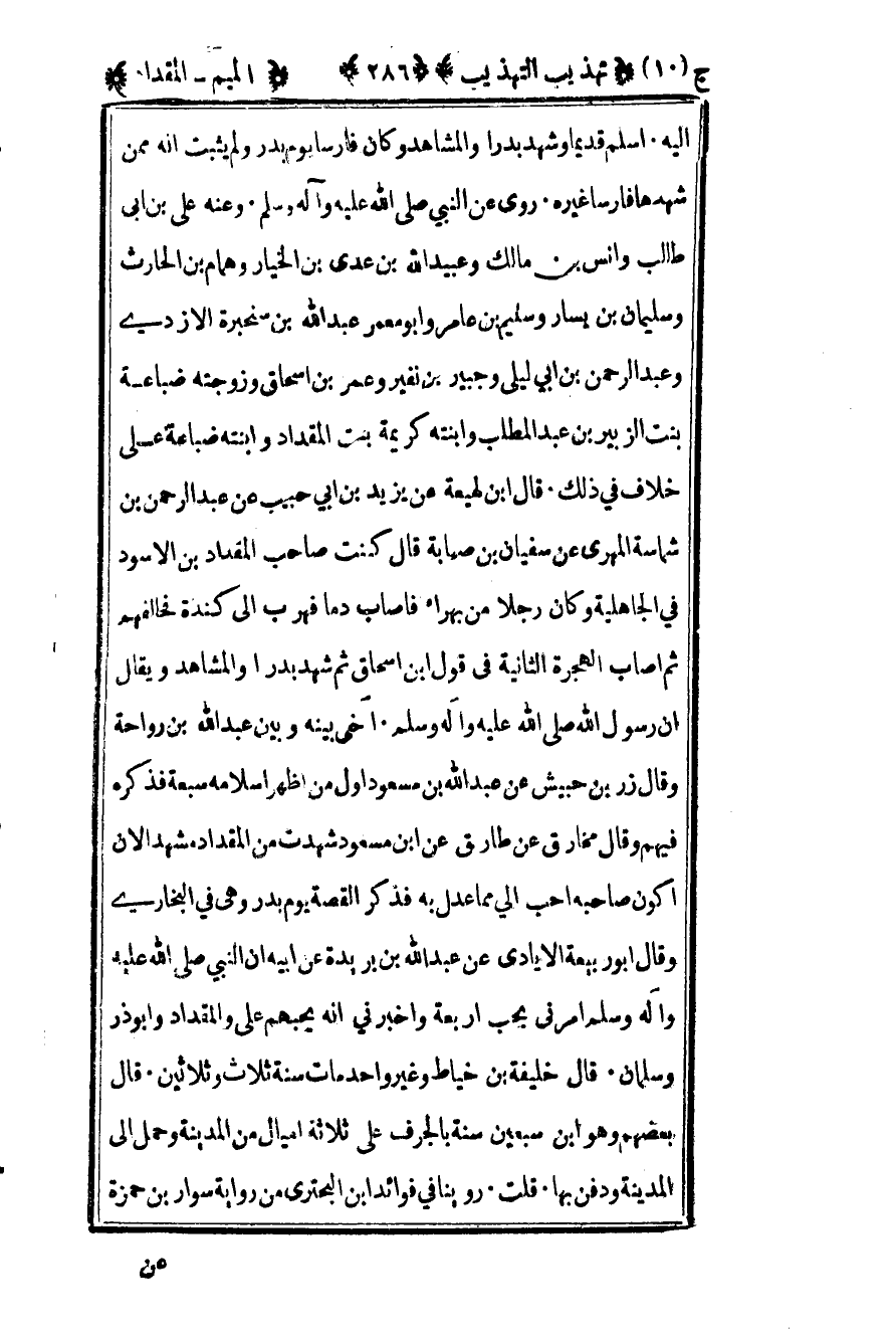 إليه أسلم قديما وشهد بدرا والمشاهد وكان فارسا يوم بدر ولم يثبت أنه ممن شهدها فارسا غيره روى عن النبي صلى الله عليه وسلم وعنه علي بن أبي طالب وأنس بن مالك وعبيد الله بن عدي بن الخيار وهمام بن الحارث وسليمان بن يسار وسليم بن عامر وأبو معمر عبد الله بن سنحبرة الأزدي وعبد الرحمن بن أبي ليلى وجبير بن نفير وعمر بن إسحاق وزوجته ضباعة بنت الزبير بن عبد المطلب وابنته كريمة بنت المقداد وابنته ضباعة على خلاف في ذلك قال بن لهيعة عن يزيد بن أبي حبيب عن عبد الرحمن بن شماسة المهري عن سفيان بن صهابة قال كنت صاحب المقداد بن الأسود في الجاهلية وكان رجلا من بهراء فأصاب دما فهرب إلى كندة فحالفهم ثم أصاب الهجرة الثانية في قول بن إسحاق ثم شهد بدرا والمشاهد ويقال أن رسول الله صلى الله عليه وسلم آخى بينه وبين عبد الله بن رواحة وقال زر بن حبيش عن عبد الله بن مسعود أول من أظهر إسلامه سبعة فذكره فيهم وقال مخارق عن طارق عن بن مسعود شهدت من المقداد مشهدا لأن أكون صاحبه أحب إلي مما عدل به فذكر القصة يوم بدر وهي في البخاري وقال أبو ربيعة الأيادي عن عبد الله بن بريدة عن أبيه أن النبي صلى الله عليه وسلم أمرني بحب أربعة وأخبرني أنه يحبهم علي والمقداد وأبو ذر وسلمان قال خليفة بن خياط وغير واحد مات سنة ثلاث وثلاثين قال بعضهم وهو بن سبعين سنة بالجرف على ثلاثة أميال من المدينة وحمل إلى المدينة ودفن بها قلت روينا في فوائد بن البحتري من رواية سوار بن حمزة
