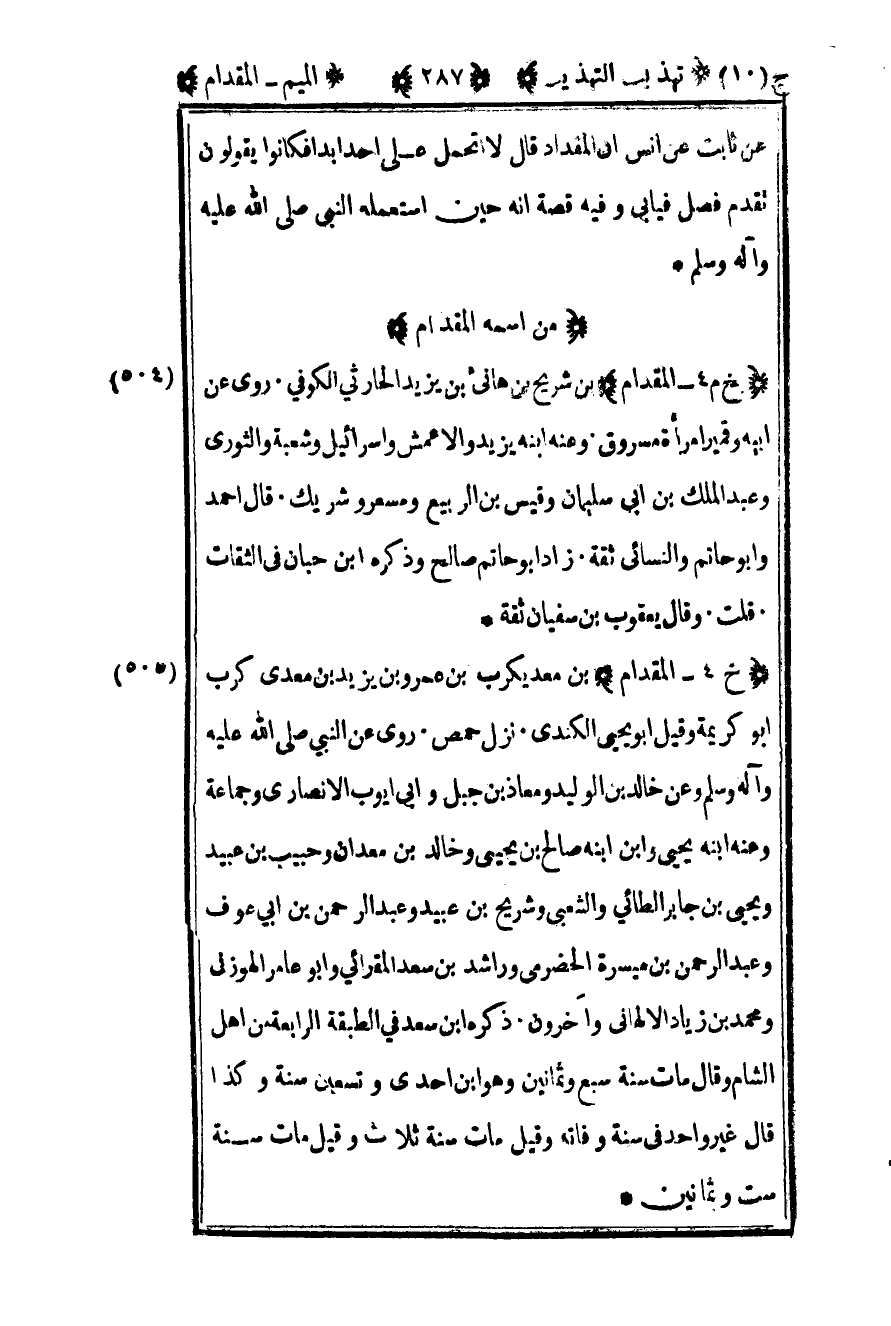 505- "خ 4 – المقدام" بن معد يكرب بن عمرو بن يزيد بن معدي كرب أبو كريمة وقيل أبو يحيى الكندي نزل حمص روى عن النبي صلى الله عليه وسلم وعن خالد بن الوليد ومعاذ بن جبل وأبي أيوب الأنصاري وجماعة وعنه ابنه يحيى وابن أبنه صالح بن يحيى وخالد بن معدان وحبيب بن عبيد ويحيى بن جابر الطائي والشعبي وشريح بن عبيد وعبد الرحمن بن أبي عوف وعبد الرحمن بن ميسرة الحضرمي وراشد بن سعد المقرائي وأبو عامر الهوزني ومحمد بن زياد الألهاني وأخرون ذكره بن سعد في الطبقة الرابعة من أهل الشام وقال مات سنة سبع وثمانين وهو بن إحدى وتسعين سنة وكذا قال غير واحد في سنة وفاته وقيل مات سنة ثلاث وقيل مات سنة ست وثمانين.
