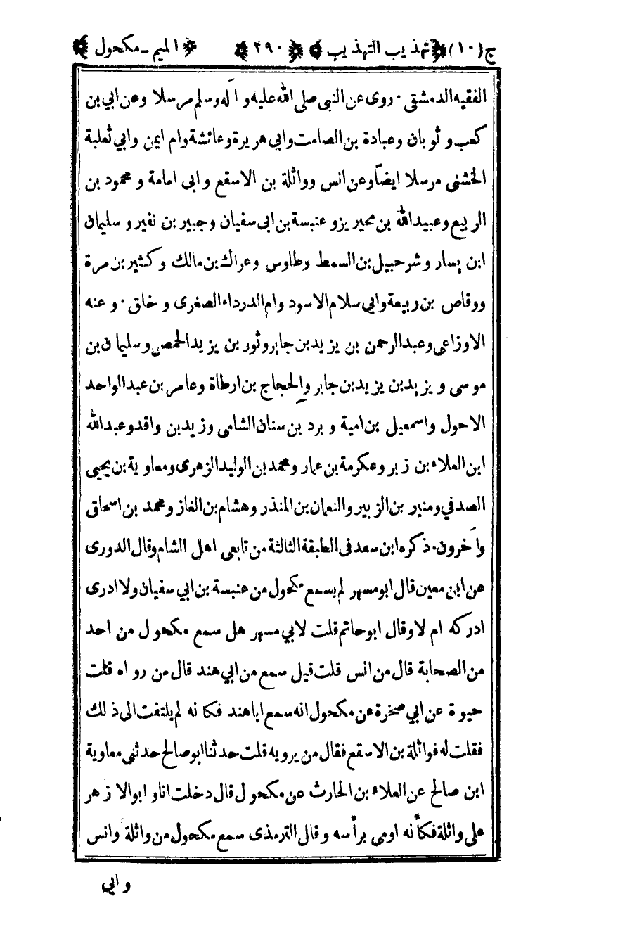 الفقيه الدمشقي روى عن النبي صلى الله عليه وسلم مرسلا وعن أبي بن كعب وثوبان وعبادة بن الصامت وأبي هريرة وعائشة وأم أيمن وأبي ثعلبة الخشني مرسلا أيضا وعن أنس ووائلة بن الأسقع وأبي أمامة ومحمود بن الربيع وعبيد الله بن محيريز وعنبسة بن أبي سفيان وجبير بن نفير وسليمان بن يسار وشرحبيل بن السمط وطاووس وعراك بن مالك وكثير بن مرة ووقاص بن ربيعة وأبي سلام الأسود وأم الدرداء الصغرى وخلق وعنه الأوزاعي وعبد الرحمن بن يزيد بن جابر وثور بن يزيد الحمصي وسليمان بن موسى ويزيد بن يزيد بن جابر والحجاج بن أرطاة وعامر بن عبد الواحد الأحول وإسماعيل بن أمية وبرد بن سنان الشامي وزيد بن واقد وعبد الله بن العلاء بن زبر وعكرمة بن عمار ومحمد بن الوليد الزهري ومعاوية بن يحيى الصدفي ومنير بن الزبير والنعمان بن المنذر وهشام بن الغاز ومحمد بن إسحاق وآخرون ذكره بن سعد في الطبقة الثالثة من تابعي أهل الشام وقال الدوري عن بن معين قال أبو مسهر لم يسمع مكحول من عنبسة بن أبي سفيان ولا أدري أدركه أم لا وقال أبو حاتم قلت لأبي مسهر هل سمع مكحول من أحد من الصحابة قال من أنس قلت قيل سمع من أبي هند قال رواه قلت حيوة عن أبي صخرة عن مكحول أنه سمع أبا هند فكأنه لم يلتفت إلى ذلك فقلت له فواثلة بن الأسقع فقال من يرويه قلت حدثنا أبو صالح حدثني معاوية بن صالح عن العلاء بن الحارث عن مكحول قال دخلت أنا وأبو الأزهر على واثلة فكأنه أومى برأسه وقال الترمذي سمع مكحول من واثلة وأنس