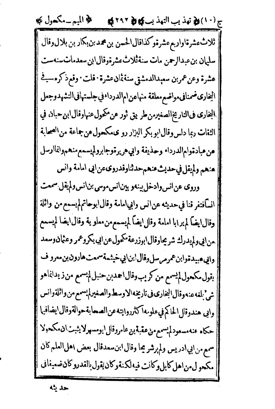 ثلاث عشرة أو أربع عشرة وكذا قال الحسن بن محمد بن بكار بن بلال وقال سليمان بن عبد الرحمن مات سنة ثلاث عشرة وقال بن سعد مات سنة ست عشرة وعن عمر بن سعيد الدمشقي سنة ثمان عشرة قلت وقع ذكره في البخاري ضمنا في مواضع معلقة منها عن أم الدرداء في جلستها في التشهد وجعل البخاري في التاريخ الصغير من طريق ثور عن مكحول عنها وقال ابن حبان في الثقات ربما دلس وقال أبو بكر البزار روى مكحول عن جماعة من الصحابة عن عبادة وأم الدرداء وحذيفة وأبي هريرة وجابر ولم يسمع منهم وإنما أرسل عنهم ولم يقل في حديث عنهم حدثنا وقد روى عن أبي إمامة وأنس.