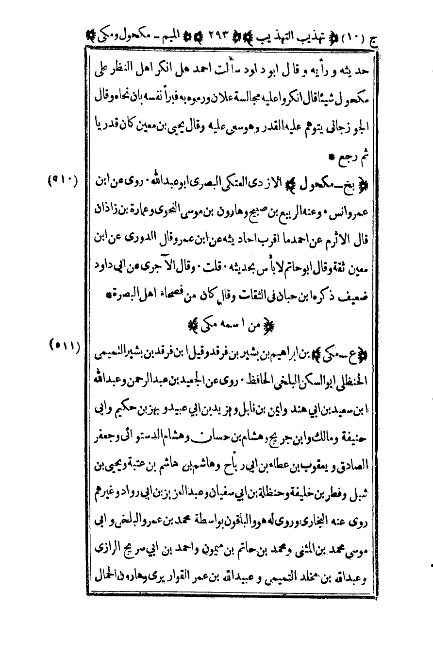 510 – "بخ – مكحول" الأزدي العتكي البصري أبو عبد الله روى عن بن عمر وأنس وعنه الربيع بن صبيح وهارون بن موسى النحوي وعمارة بن زاذان قال الأثرم عن أحمد ما أقرب أحاديثه عن بن عمر وقال الدوري عن ابن معين ثقة وقال أبو حاتم لا بأس بحديثه قلت وقال الآجري عن أبي داود ضعيف ذكره ابن حبان في الثقات وقال كان من فصحاء أهل البصرة.