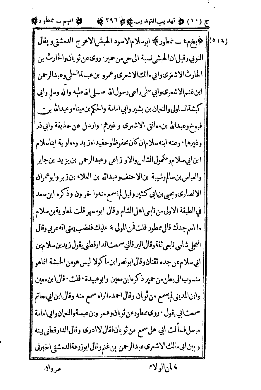 514- "بخ م 4 – ممطور" أبو سلام الأسود الحبشي الأعرج الدمشقي ويقال النوبي وقيل إن الحبشي نسبة إلى حي من حمير روى عن ثوبان والحارث بن الحارث الأشعري وأبي مالك الأشعري وعمرو بن عبسة السلمي وعبد الرحمن بن غنم الأشعري وأبي سلمى راعي رسول الله صلى الله عليه وسلم وأبي كبشة السلولي والنعمان بن بشير وأبي إمامة والحكم بن ميناء وعبد الله بن فروخ وعبد الله بن معانق الأشعري وغيرهم وأرسل عن حذيفة وأبي ذر وغيرهما وعنه ابنه سلام إن كان محفوظا وحفيداه زيد ومعاوية ابنا سلام بن أبي سلام ومكحول الشامي والأوزاعي وعبد الرحمن بن يزيد بن جابر والعباس بن سالم وشيبة بن الأحنف وعبد الله بن العلاء بن زبر وأبو عمران الأنصاري ويحيى بن أبي كثير وقيل لم يسمع منه وآخرون وذكره ابن سعد في الطبقة الأولى من تابعي أهل الشام وقال أبو مسهر قلت لمعاوية بن سلام ما اسم جدك قال ممطور قلت فمن المولى عليك فغضب يعني أنه عربي وقال العجلي شامي تابعي ثقة وقال البرقاني سمعت الدارقطني يقول زيد بن سلام بن أبي سلام عن جده ثقتان وقال أبو نصر بن ماكولا ليس هو من الحبشة إنما هو منسوب إلى بطن من حمير ذكره ابن معين وأبو عبيدة قلت قال بن معين وابن المديني لم يسمع من ثوبان وقال أحمد ما أراه سمع منه وقال ابن أبي حاتم سمعت أبي يقول روى ممطور عن ثوبان وعمرو بن عبسة والنعمان وأبي إمامة مرسل فسألت أبي هل سمع من ثوبان فقال لا أدري وقال الدارقطني بينه وبين أبي مالك الأشعري عبد الرحمن بن غنم وقال أبو زرعة الدمشقي أخبرني مروان قال قلت لمعاوية سمع جدك من كعب قال لا أدري.