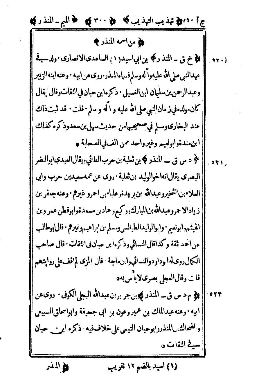 520- "خ ق – المنذر" بن أبي أسيد1 الساعدي الأنصاري ولد في عهد النبي صلى الله عليه وسلم فسماه المنذر روى عن أبيه وعنه ابنه الزبير وعبد الرحمن بن سليمان بن الغسيل ذكره بن حبان في الثقات وقال يقال كان مولده في زمان النبي صلى الله عليه وسلم قلت قد ثبت ذلك عند البخاري ومسلم في صحيحيهما من حديث سهل بن سعد وذكره كذلك بن مندة وأبو نعيم وغير واحد ممن ألف في الصحابة.