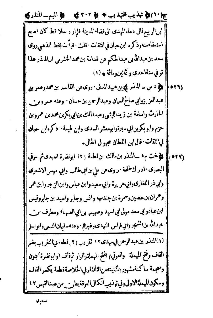 526 – "د س – المنذر" بن عبيد المدني روى عن القاسم بن محمد وعمر بن عبد العزيز وأبي صالح السمان وعبد الرحمن بن حسان وعنه عمرو بن الحارث وأسامة بن زيد الليثي وعبد الملك بن أبي بكر بن محمد بن عمرو بن حزم وأبو بكر بن أبي سبرة وأبو معشر السدي وابن لهيعة ذكره بن حبان في الثقات قال أبن القطان مجهول الحال.