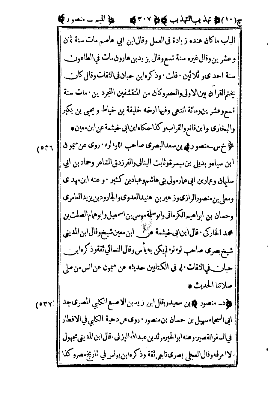 536- "خ س – منصور" بن سعد البصري صاحب اللؤلؤ روى عن ميمون بن سياه وبديل بن ميسرة وثابت البناني والفرزدق الشاعر وحماد بن أبي سليمان وعمار بن أبي عمار مولى بني هاشم وعباد بن كثير وعنه بن مهدي ومعلى بن منصور الرازي وزهير بن هنيد العدوي والجارود بن يزيد العامري وحسان بن إبراهيم الكرماني وأبو سلمة موسى بن إسماعيل وأبو همام الصلت بن محمد الخاركي قال ابن أبي خيثمة عن ابن معين شيخ وقال بن المديني شيخ بصري صاحب لؤلؤ يكن به بأس وقال النسائي ثقة وذكره ابن حبان في الثقات له في الكتابين حديثه عن ميمون عن أنس من صلى صلاتنا الحديث.