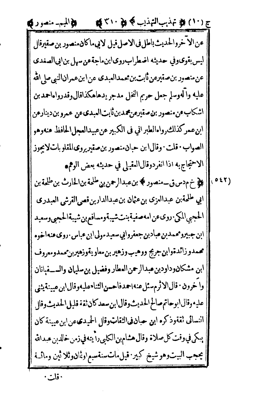 542 – "خ م د س ق – منصور" بن عبد الرحمن بن طلحة بن الحارث بن طلحة بن أبي طلحة بن عبد العزي بن عثمان بن عبد الدار بن قصي القرشي العبدري الحجي المكي روى عن أمه صفية بنت شيبة ومسافع بن شيبة الحجبي وسعيد بن جبير ومحمد بن عباد بن جعفر وأبي سعيد مولى بن عباس روى عنه أخوه محمد وزائدة وابن جريج ووهيب وزهير بن معاوية وزهير بن محمد ومعروف بن مشكان وداود بن عبد الرحمن العطار وفضيل بن سليمان والسفيانان وآخرون قال الأثرم سئل عنه أحمد فأحسن الثناء عليه وقال بن عيينة يثني عليه وقال أبو حاتم صالح الحديث وقال بن سعد كان ثقة قليل الحديث وقال النسائي ثقة وذكره بن حبان في الثقات وقال الحميدي عن بن عيينة كان يبكي في وقت كل صلاة وقال هشام بن الكلبي رأيته في زمن خالد بن عبد الله يحجب البيت وهو شيخ كبير قيل مات سنة سبع أو ثمان وثلاثين ومائة.