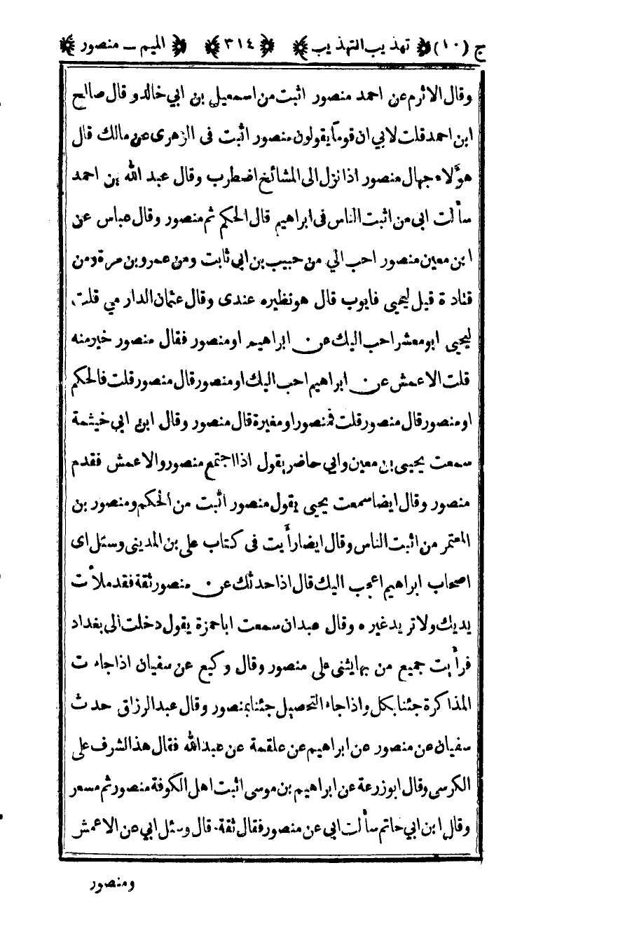 وقال الأثرم عن أحمد منصور أثبت من إسماعيل بن أبي خالد وقال صالح بن أحمد قلت لأبي إن قوما يقولون منصور أثبت في الزهري عن مالك قال هؤلاء جهال منصور إذا نزل إلى المشائخ اضطرب وقال عبد الله بن أحمد سألت أبي من أثبت الناس في إبراهيم قال الحكم ثم منصور وقال عباس عن بن معين منصور أحب إلي من حبيب بن أبي ثابت ومن عمرو بن مرة ومن قتادة قيل ليحيى فأيوب قال هو نظيره عندي وقال عثمان الدارمي قلت ليحيى أبو معشر أحب إليك عن إبراهيم أو منصور فقال منصور خير منه قلت الأعمش عن إبراهيم أحب إليك أو منصور قال منصور قلت فالحكم أو منصور قال منصور قلت فمنصور أو مغيرة قال منصور وقال بن أبي خيثمة سمعت يحيى بن معين وأبي حاضر يقول إذا اجتمع منصور والأعمش فقدم منصور وقال أيضا سمعت يحيى يقول منصور أثبت من الحكم ومنصور بن المعتمر من أثبت الناس وقال أيضا رأيت في كتاب علي بن المديني وسئل أي أصحاب إبراهيم أعجب إليك قال إذا حدثك عن منصور ثقة فقد ملأت يديك ولا تريد غيره وقال عبدان سمعت أبا حمزة يقول دخلت إلى بغداد فرأيت جميع من بها يثني على منصور وقال وكيع عن سفيان إذا جاءت المذاكرة جئنا بكل وإذا جاء التحصيل جئنا بمنصور وقال عبد الرزاق حدث سفيان عن منصور عن إبراهيم عن علقمة عن عبد الله فقال هذا الشرف على الكرسي وقال أبو زرعة عن إبراهيم بن موسى أثبت أهل الكوفة منصور ثم مسعر وقال ابن أبي حاتم سألت أبي عن منصور فقال ثقة قال وسئل أبي عن الأعمش