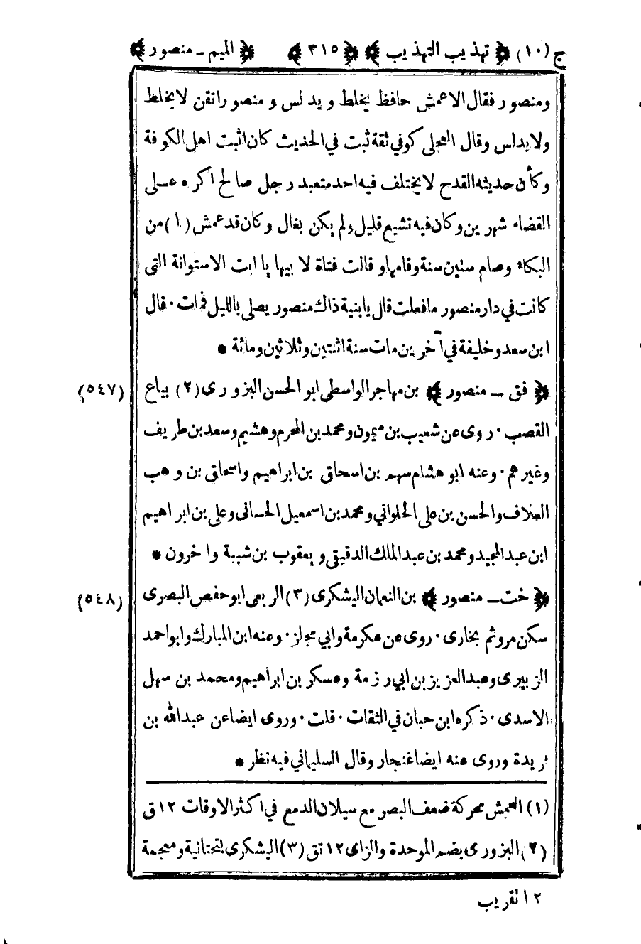 547 – "فق – منصور" بن مهاجر الواسطي أبو الحسي البزوري2 بياع القصب روى عن شعيب بن ميمون ومحمد بن المحرم وهشيم وسعد بن طريف وغيرهم وعنه أبو هشام سهم بن إسحاق بن إبراهيم وإسحاق بن وهب العلاف والحسن بن علي الحلواني ومحمد بن إسماعيل الحساني وعلي بن إبراهيم بن عبد المجيد ومحمد بن عبد الملك الدقيقي ويعقوب بن شيبة وآخرون.
